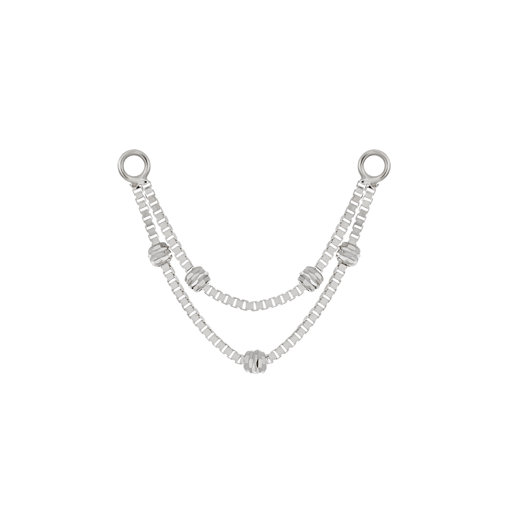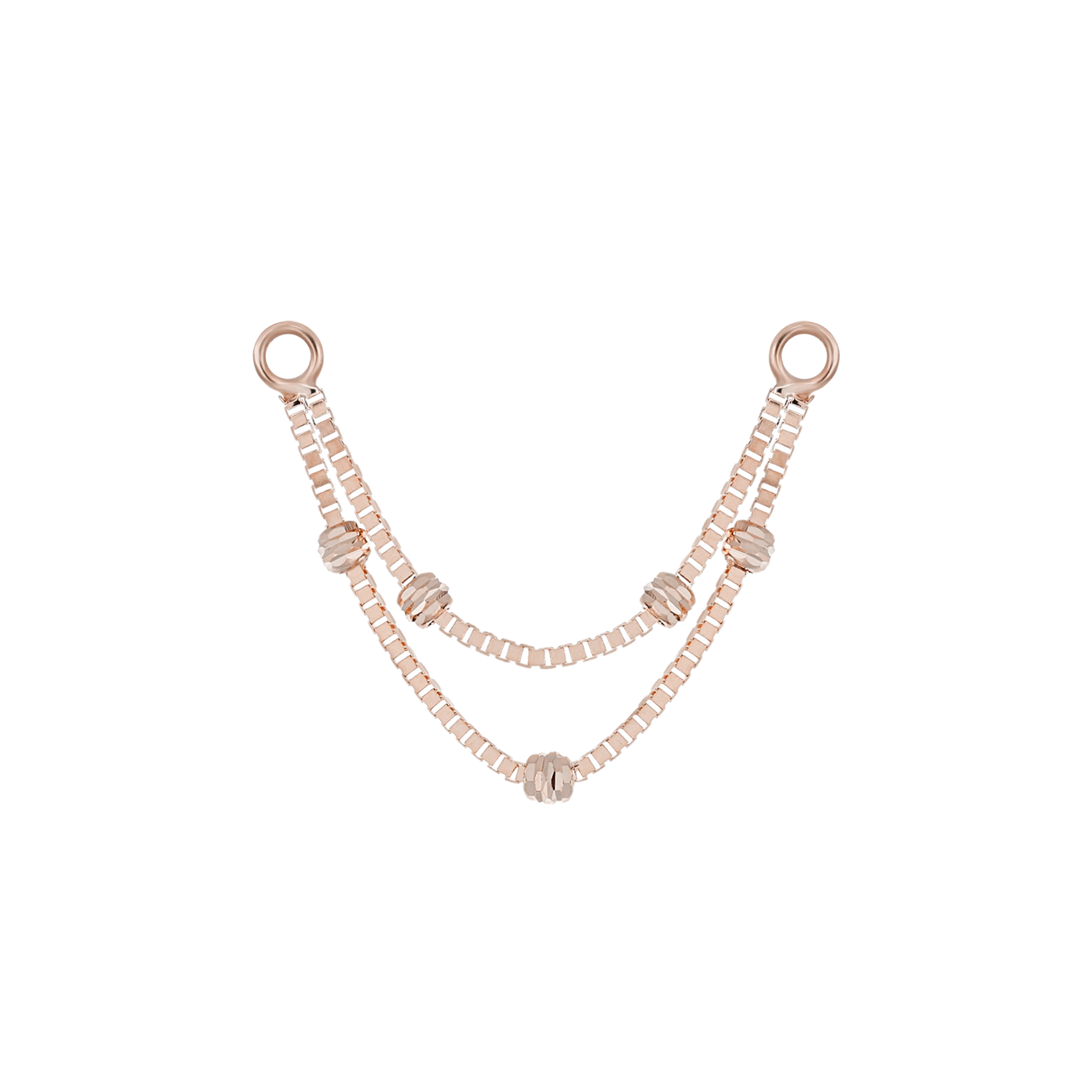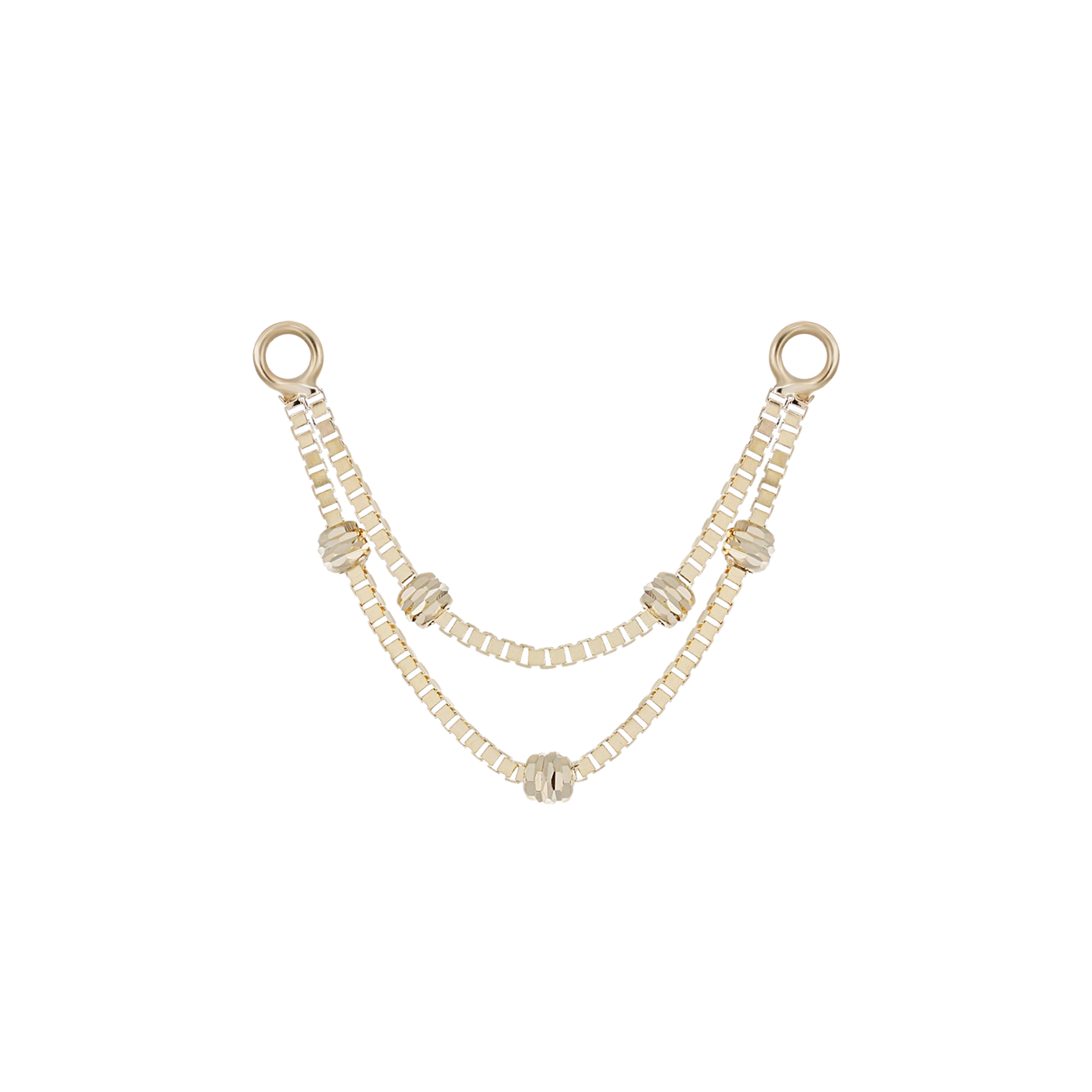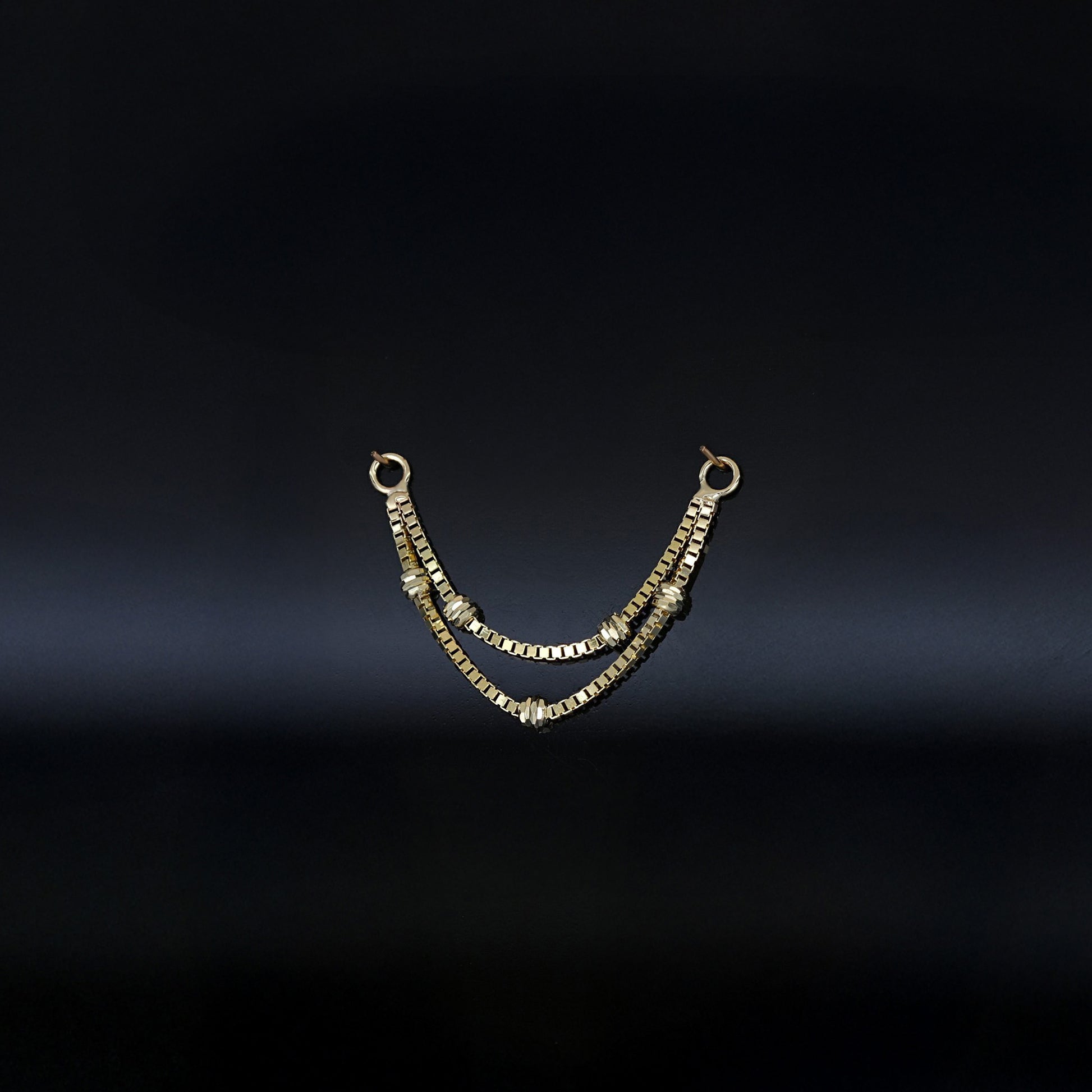 A refined double-chain attachment crafted from classic box chains accented with diamond cut gold beads. The balanced structure and soft drape add a touch of understated movement to any ear styling — perfect for linking two piercings or pairing with hoops and gemstone studs.