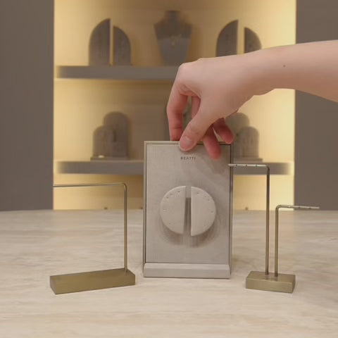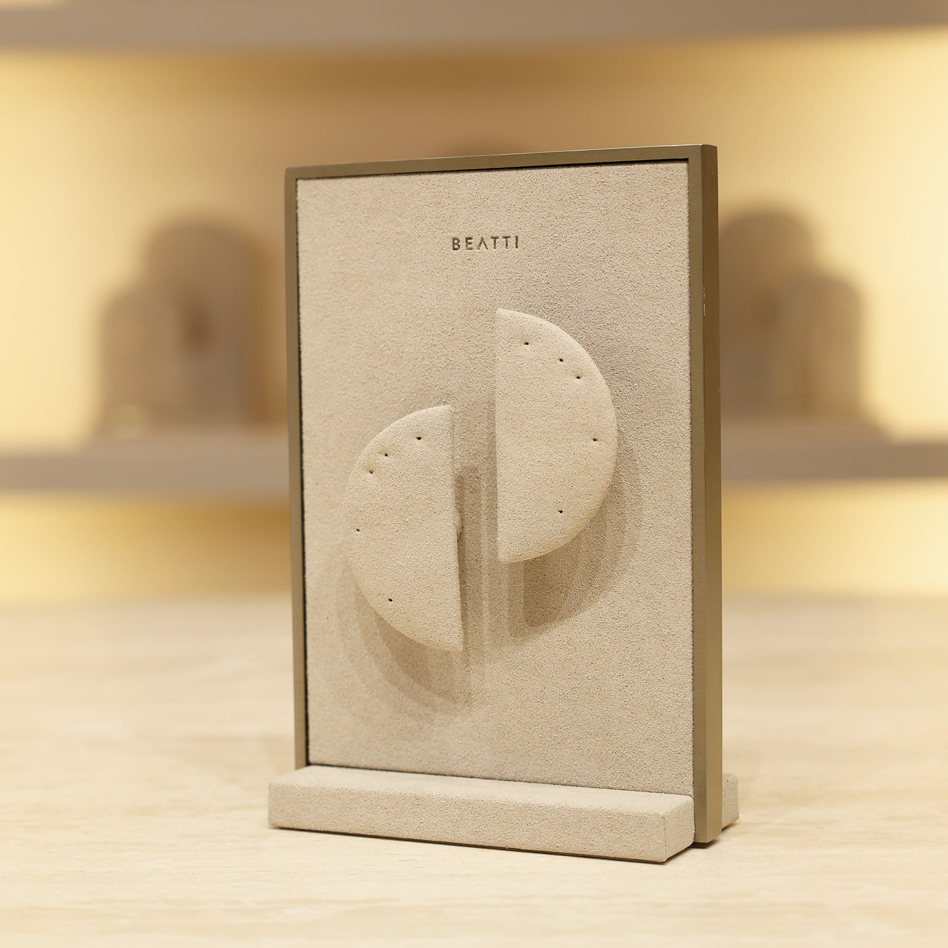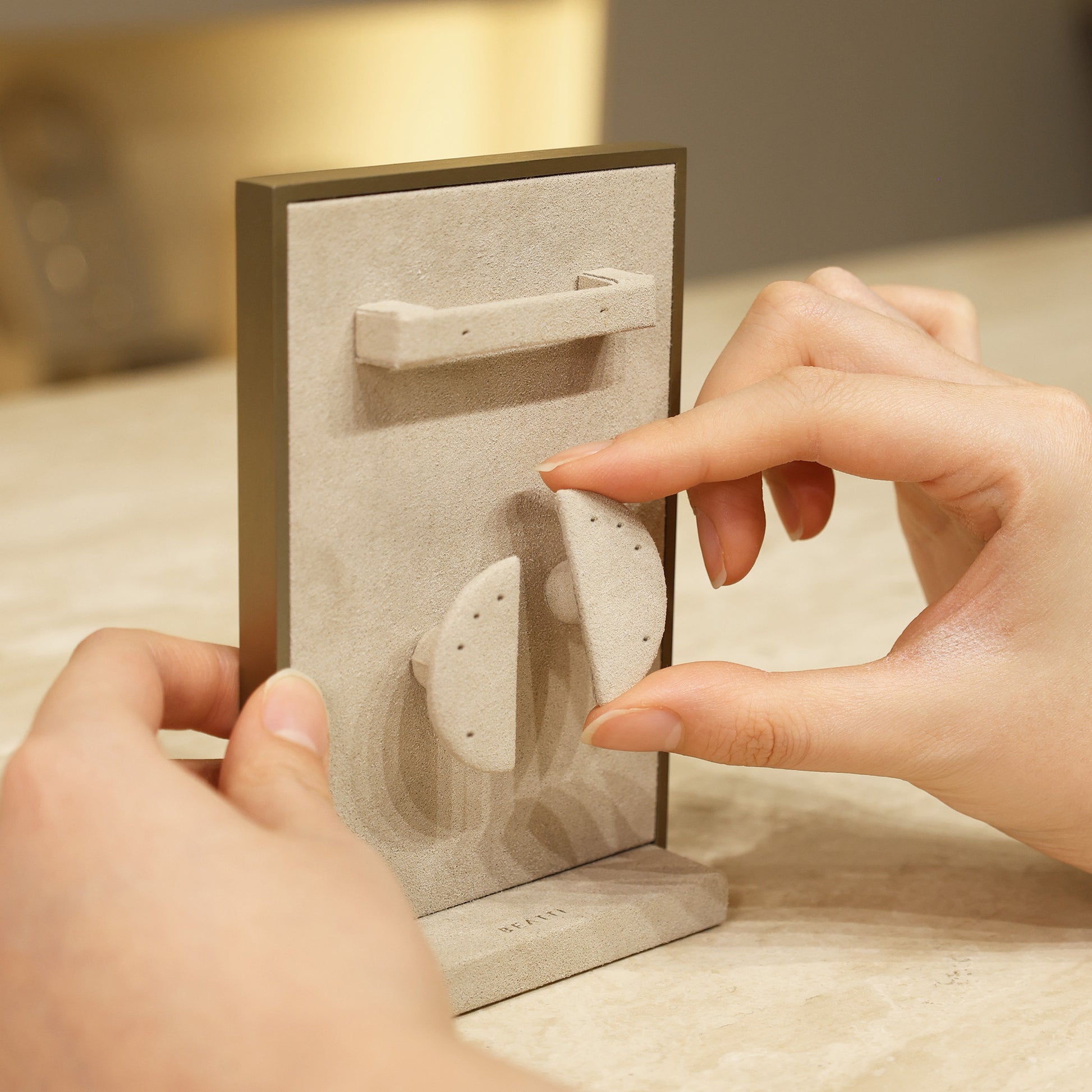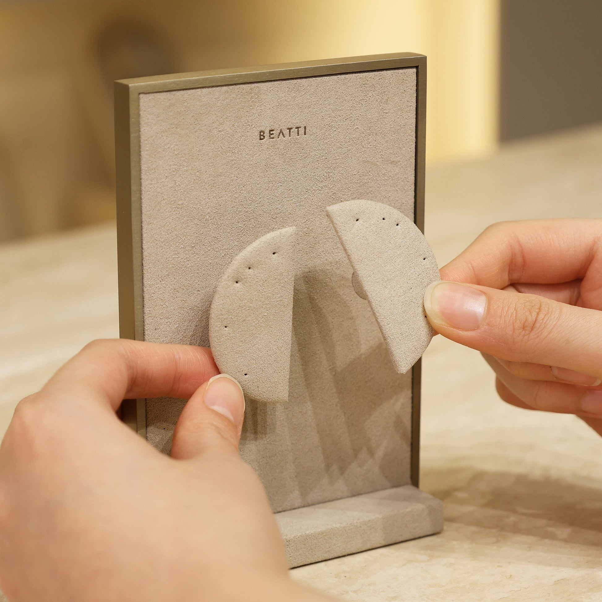 Total Freedom in Curation: Unlike fixed displays, our magnetic system allows you to curate your layout with total freedom. Whether you are showcasing tiny threadless ends or extra-long threaders and chains, you can simply adjust the height of your mounts to create the perfect arrangement. The sandstone microfiber surface provides a neutral, matte backdrop that highlights the brilliance of 14k gold while naturally hiding dust and fingerprints—ensuring your display looks pristine all day.