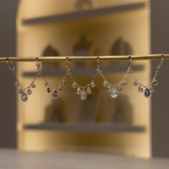 The Colette chain charm brings a touch of refined luxury to any ear stack. Five faceted gemstones cascade gracefully, anchored by a center teardrop framed in intricate milgrain detail. The surrounding round and pear-cut accents create a balanced, chandelier-like effect that shimmers with every movement.