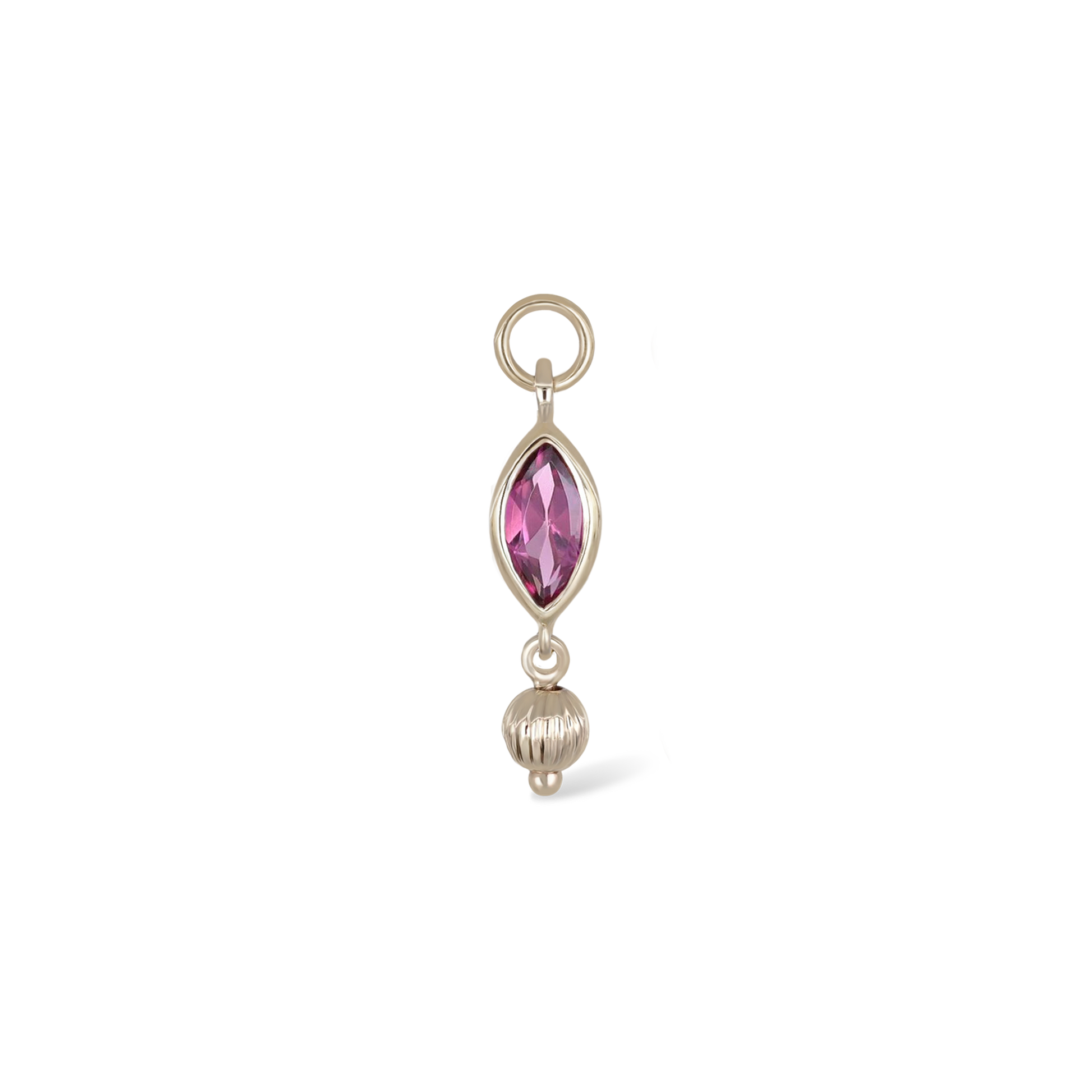 The Aris II charm pairs a marquise-cut gemstone with a ribbed golden bead accent. Available in moonstone, amethyst, or pink tourmaline, it brings both color and texture into a sleek, elongated drop.