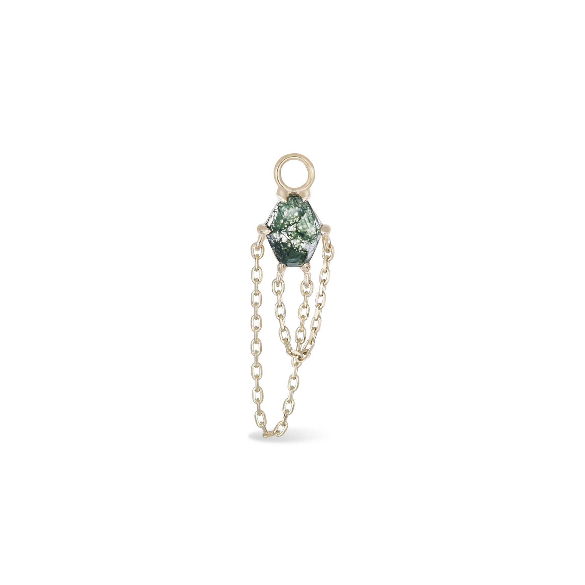 An elegant hexagon-cut gemstone sits in a six-prong 14k gold setting, framed by two fluid chains that drape softly for a balanced, architectural look. The Lyra brings together structure and movement, catching light from every angle with a subtle, refined shimmer.