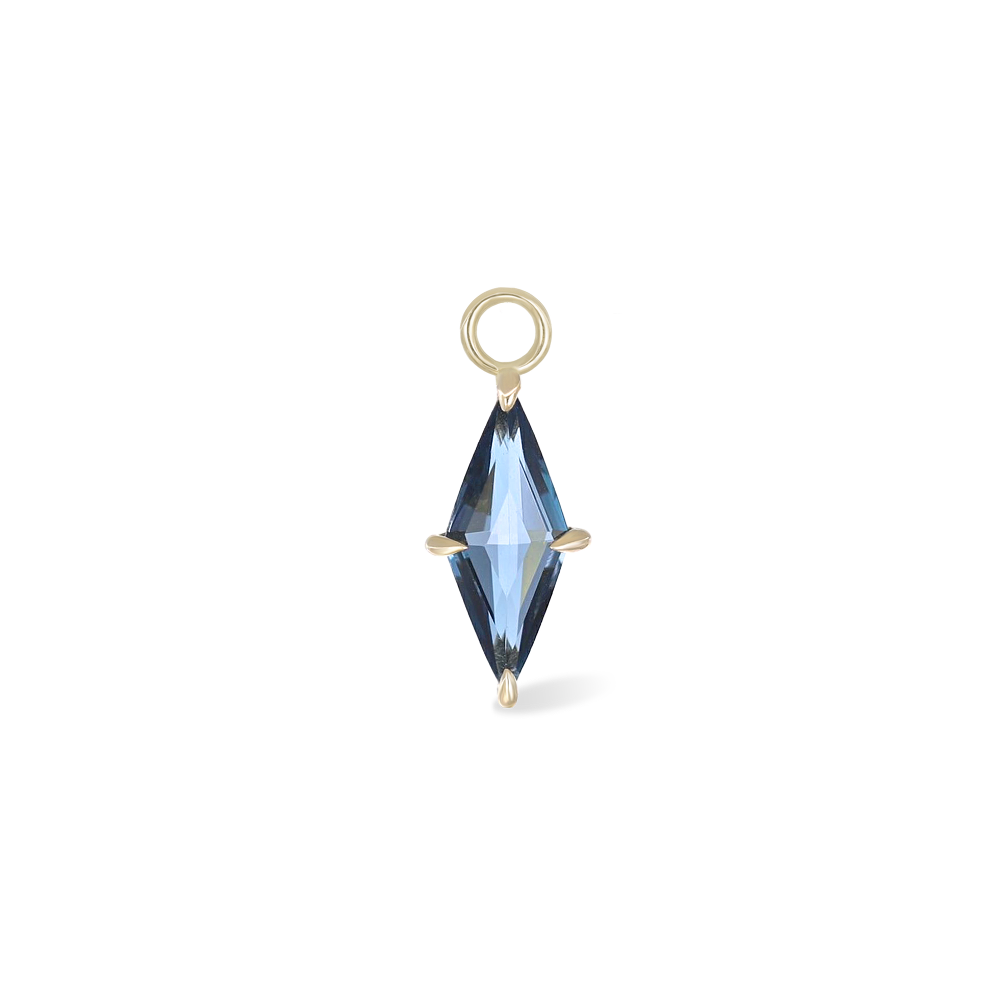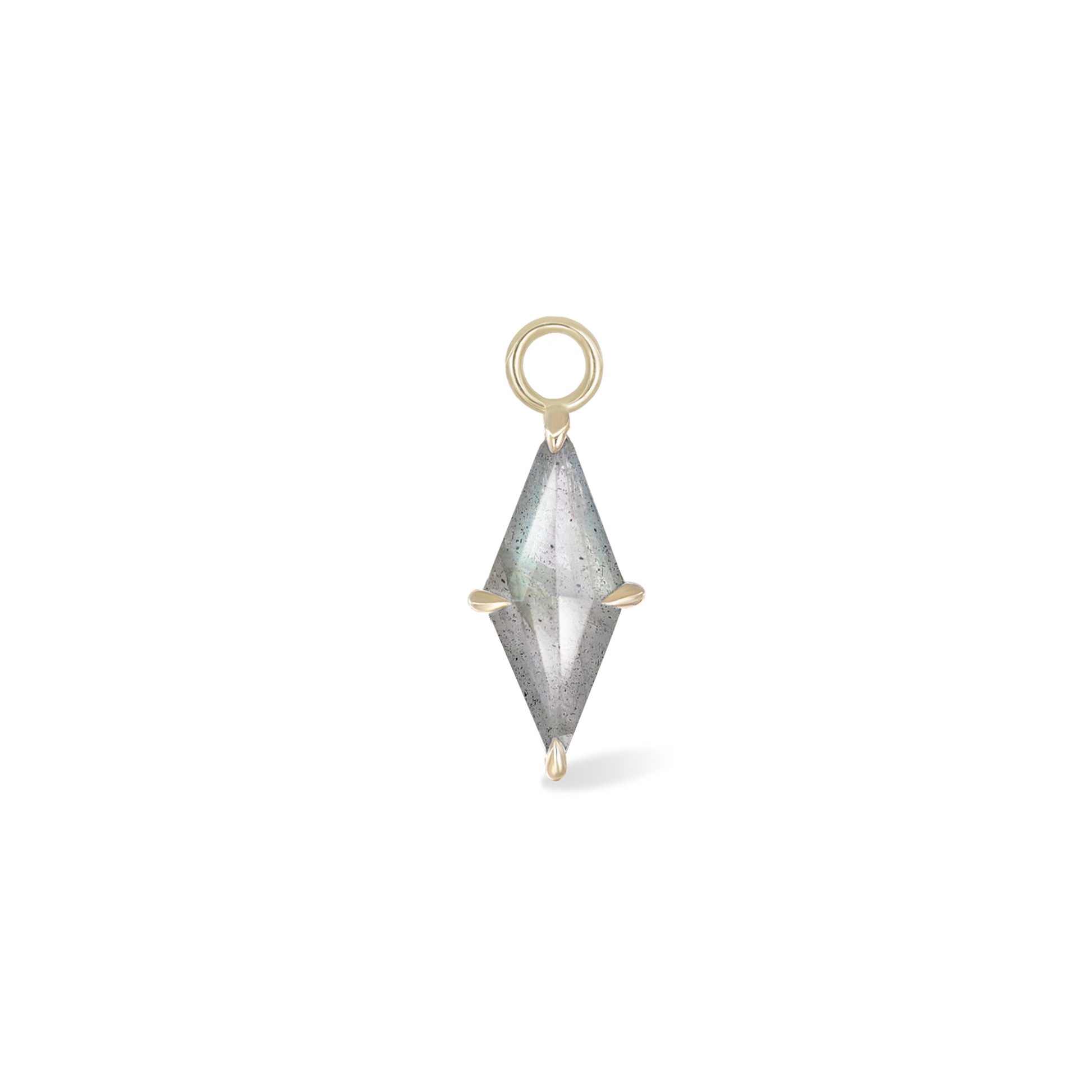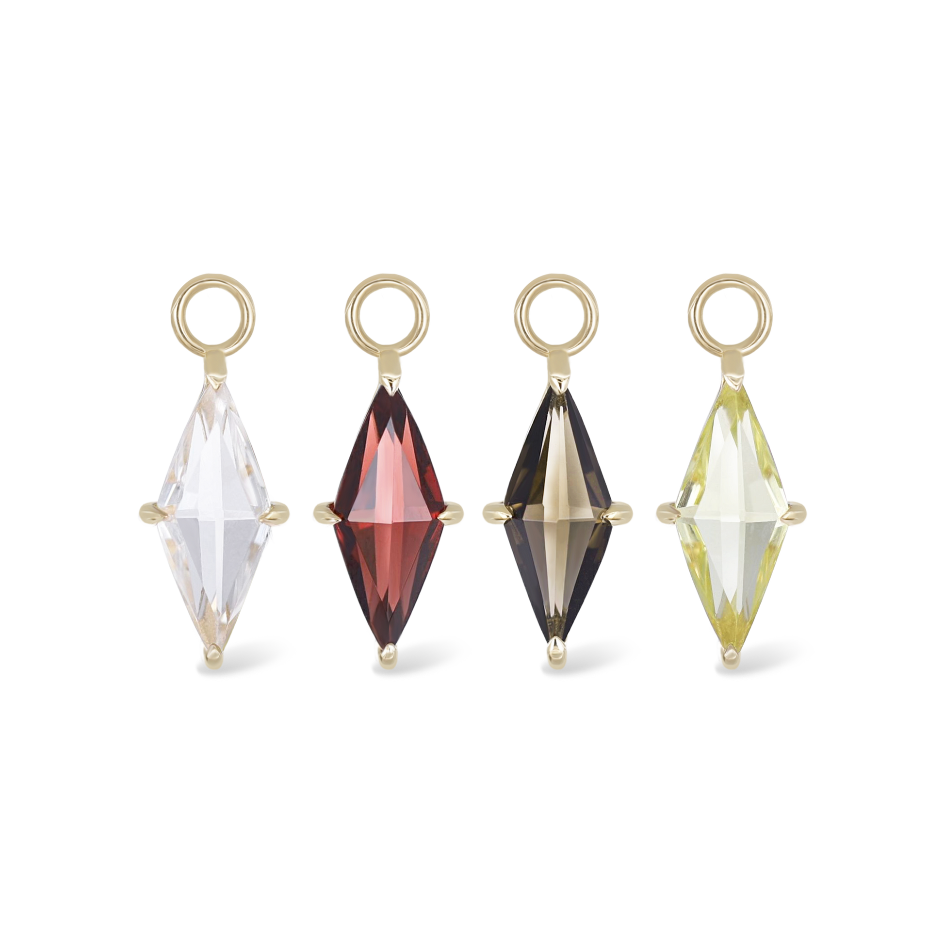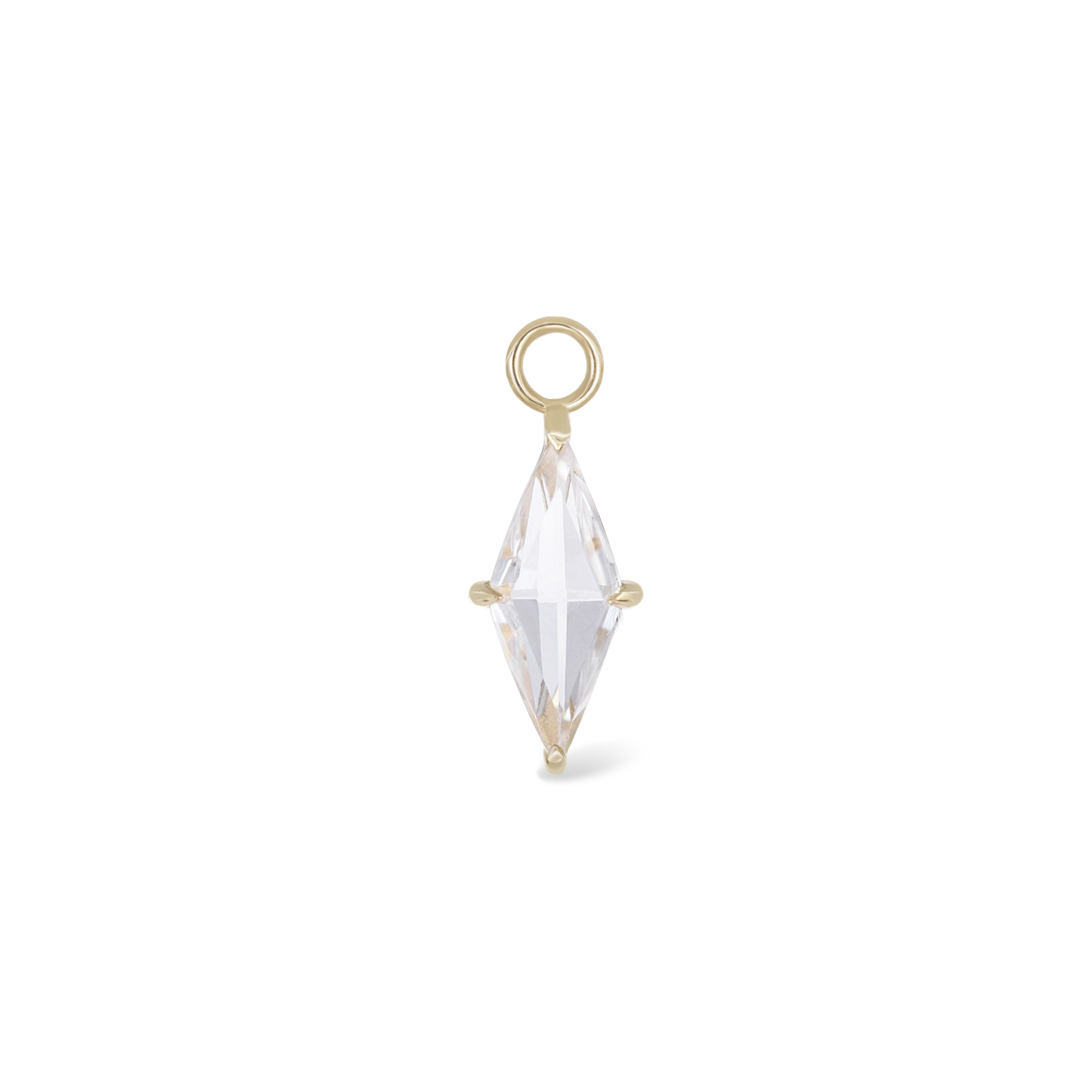 The Prisma charm is defined by its elongated kite cut—sharp angles and mirrored symmetry that create a refined, geometric silhouette. Set in a 14k gold four-prong setting, each stone reflects light across its facets with clean brilliance.