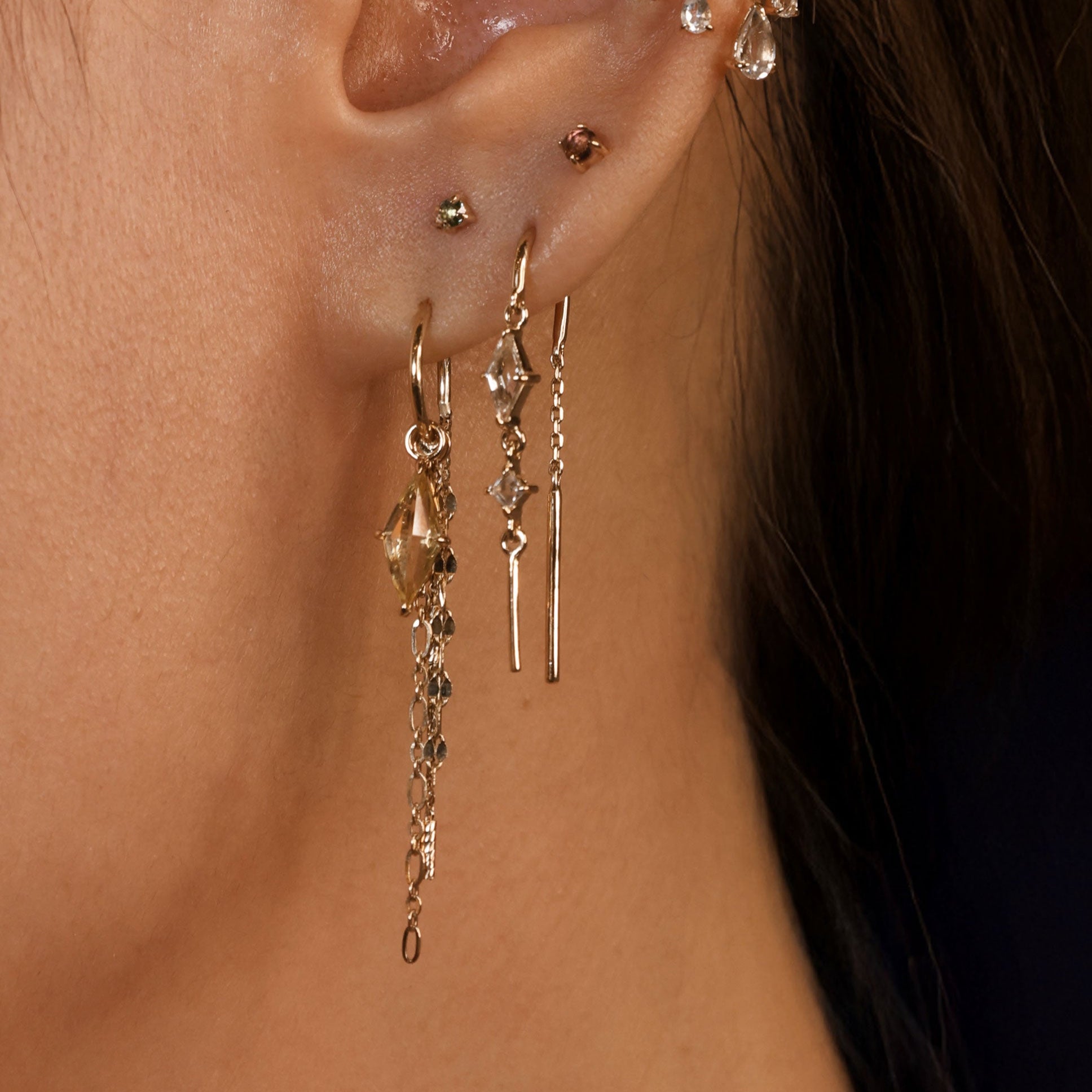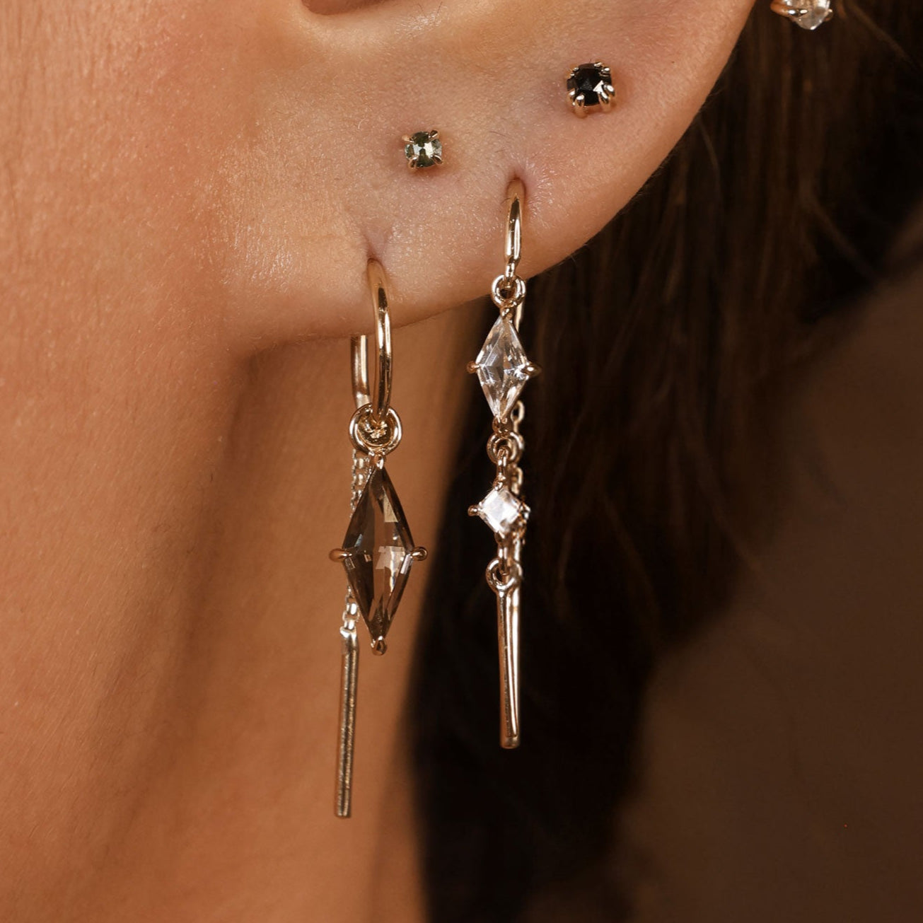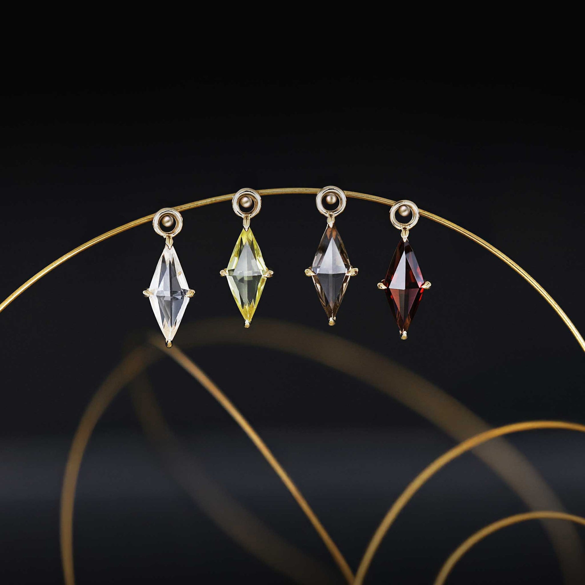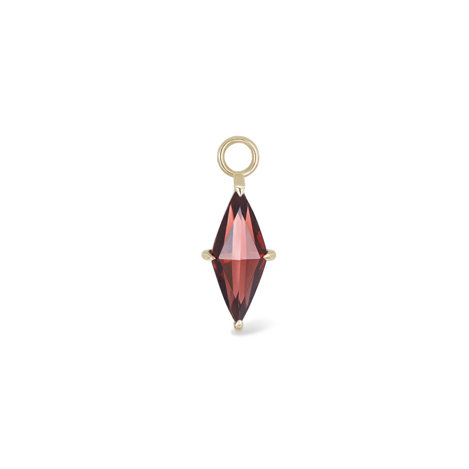 The Prisma charm is defined by its elongated kite cut—sharp angles and mirrored symmetry that create a refined, geometric silhouette. Set in a 14k gold four-prong setting, each stone reflects light across its facets with clean brilliance.