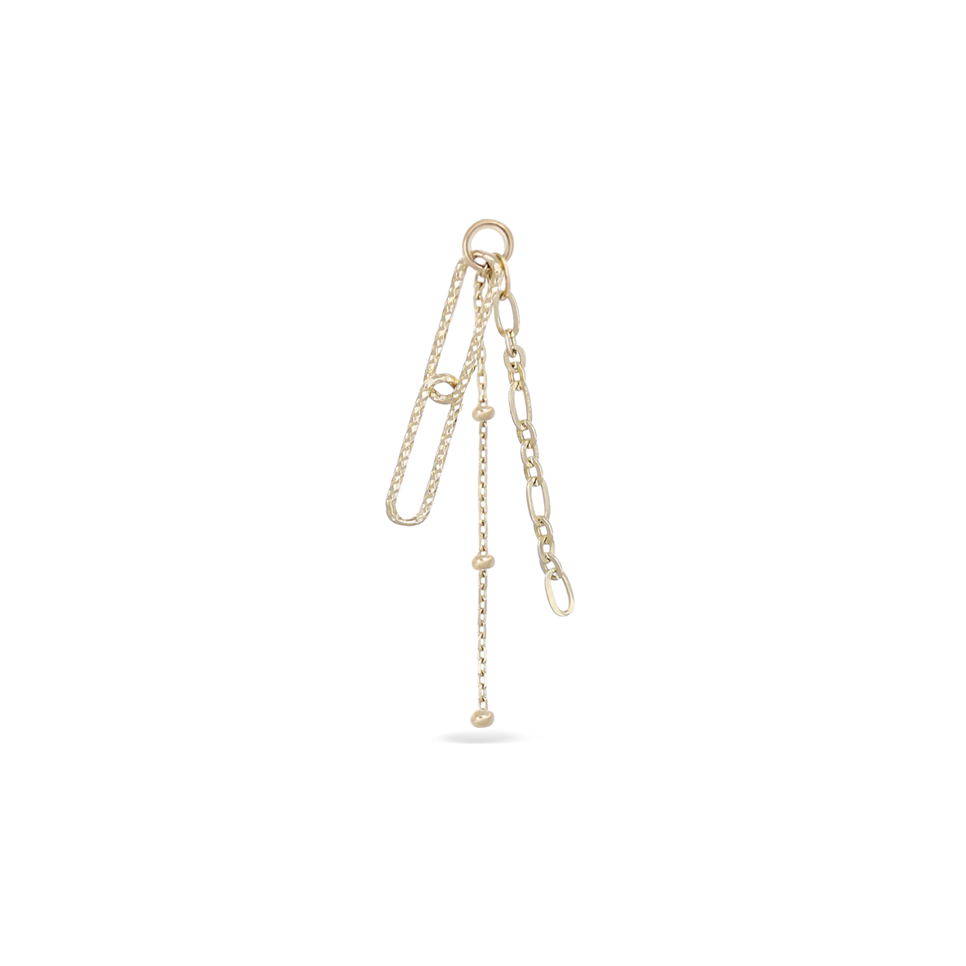 Part of our new triple mixed chain charm series, the Vivo combines three contrasting chains in one design—a bold paperclip link, an oval-link chain, and a fine ball-accented strand. Shorter in length but full of presence, it brings movement and layered texture to any hoop or stack.