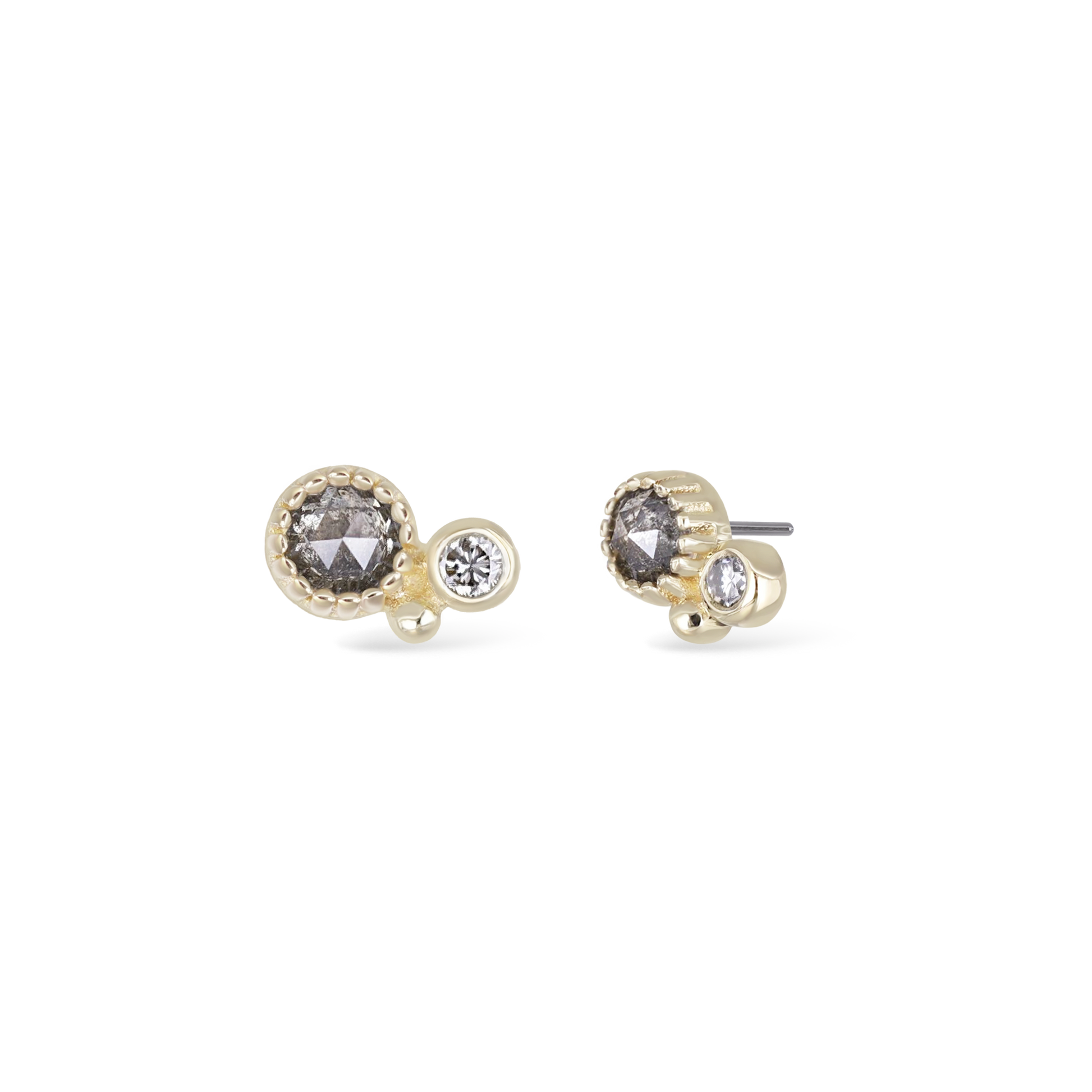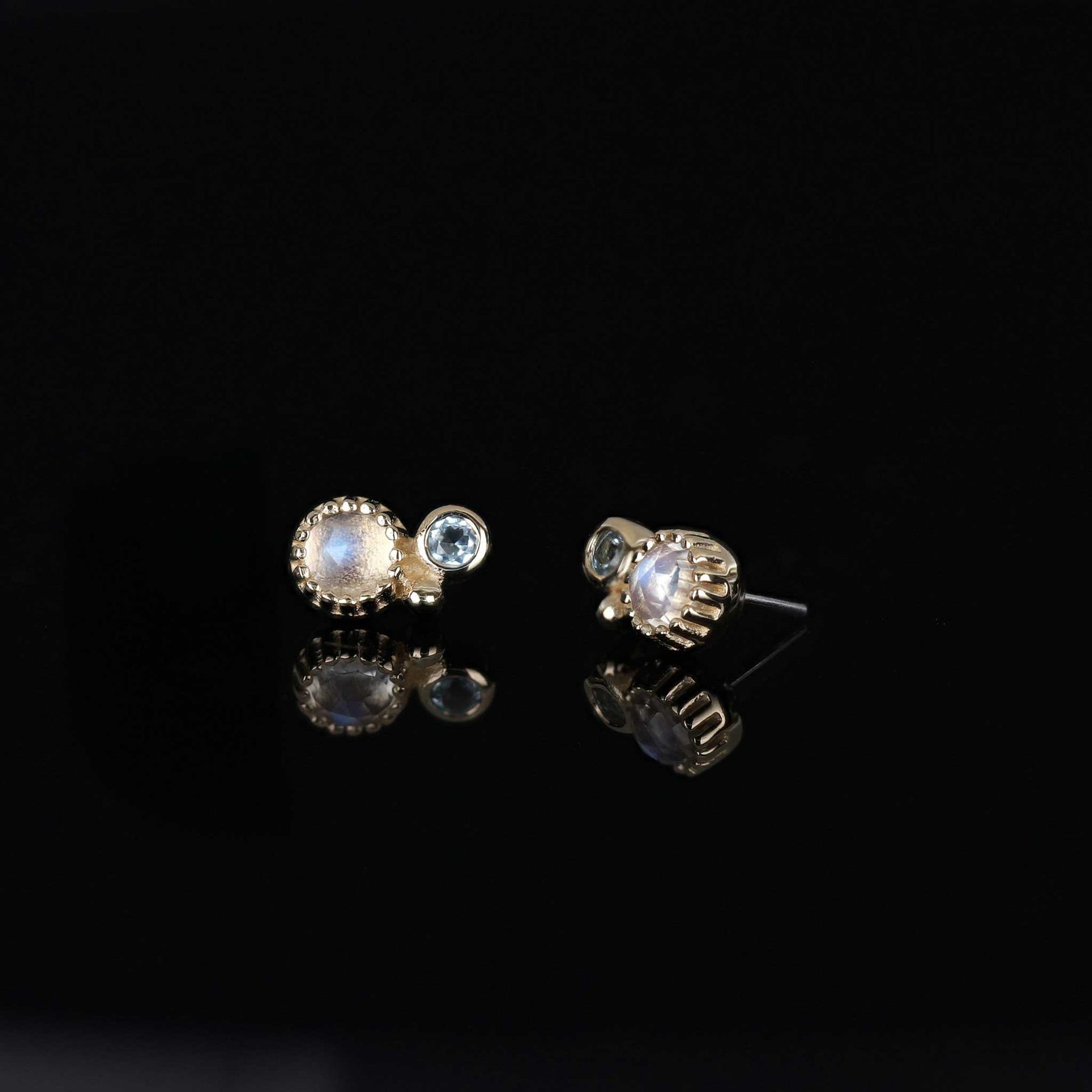 A modern two-stone pairing, the Twinette brings together contrasting gems in a delicate milgrain frame. On the left, a rose-cut moonstone glows with soft iridescence beside a crisp Swiss blue topaz. On the right, a rose-cut salt and pepper diamond pairs with a brilliant white diamond for a mix of edge and sparkle.