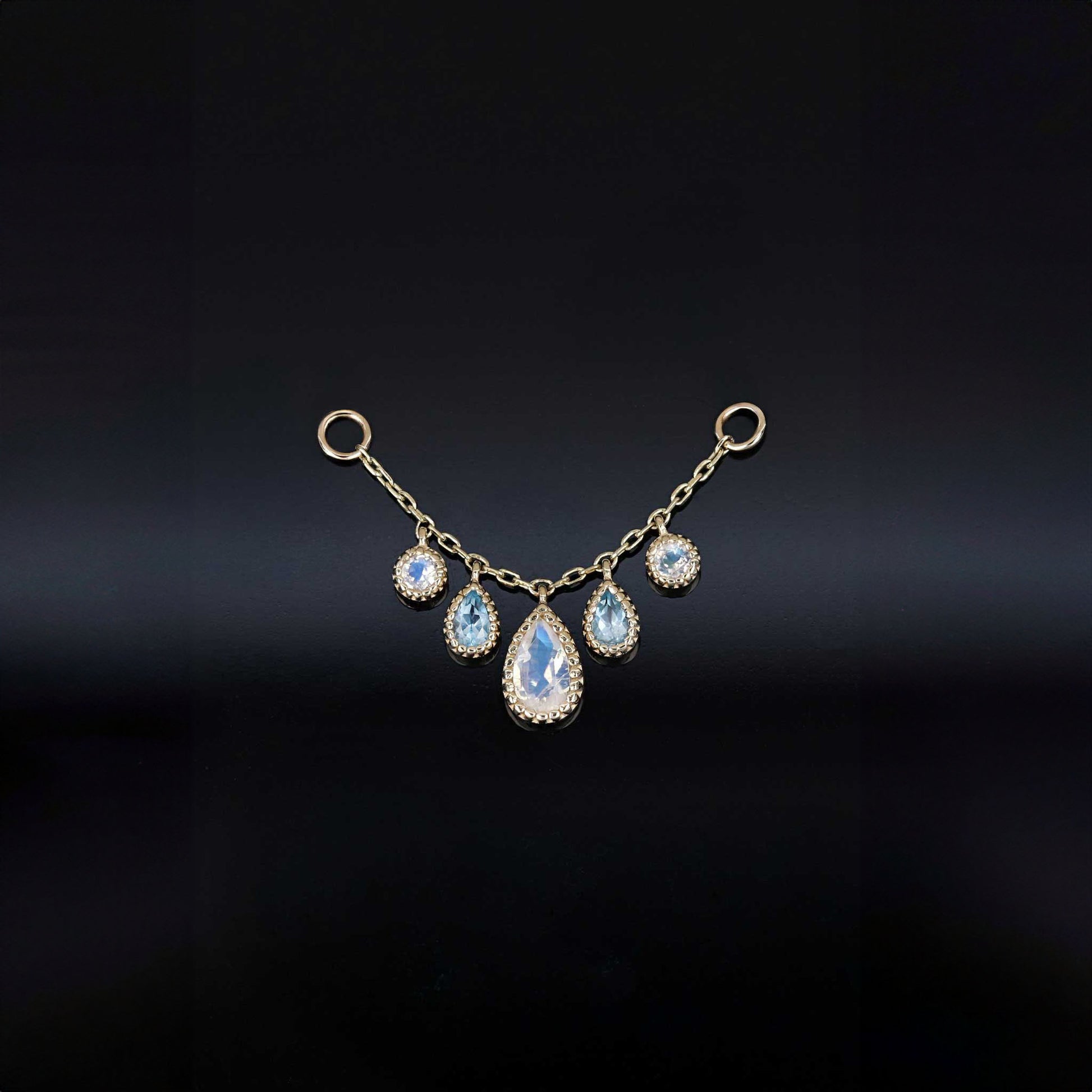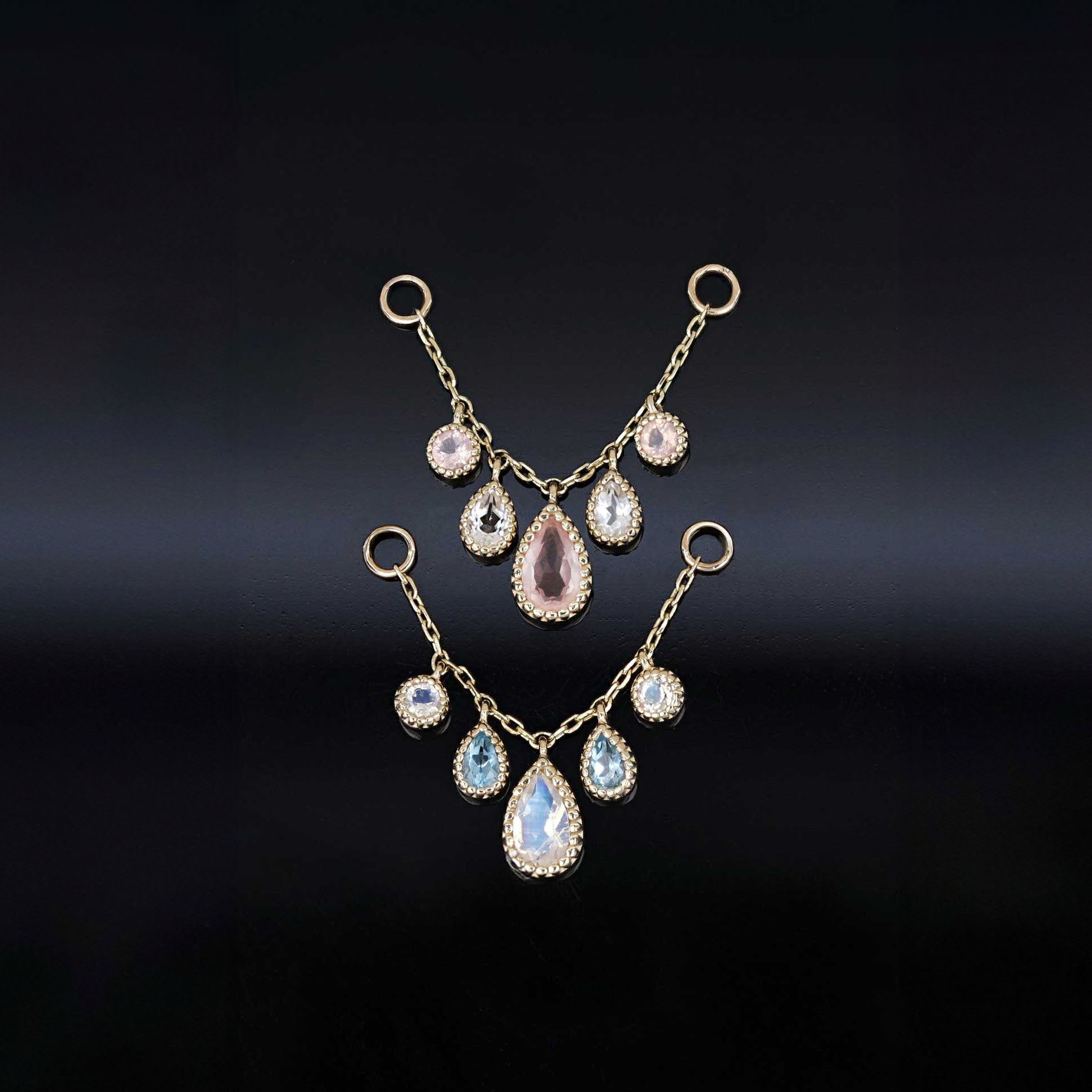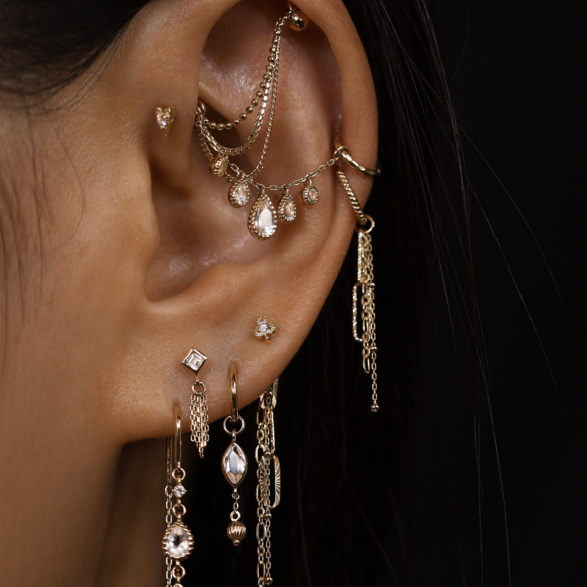 The Colette chain charm brings a touch of refined luxury to any ear stack. Five faceted gemstones cascade gracefully, anchored by a center teardrop framed in intricate milgrain detail. The surrounding round and pear-cut accents create a balanced, chandelier-like effect that shimmers with every movement.