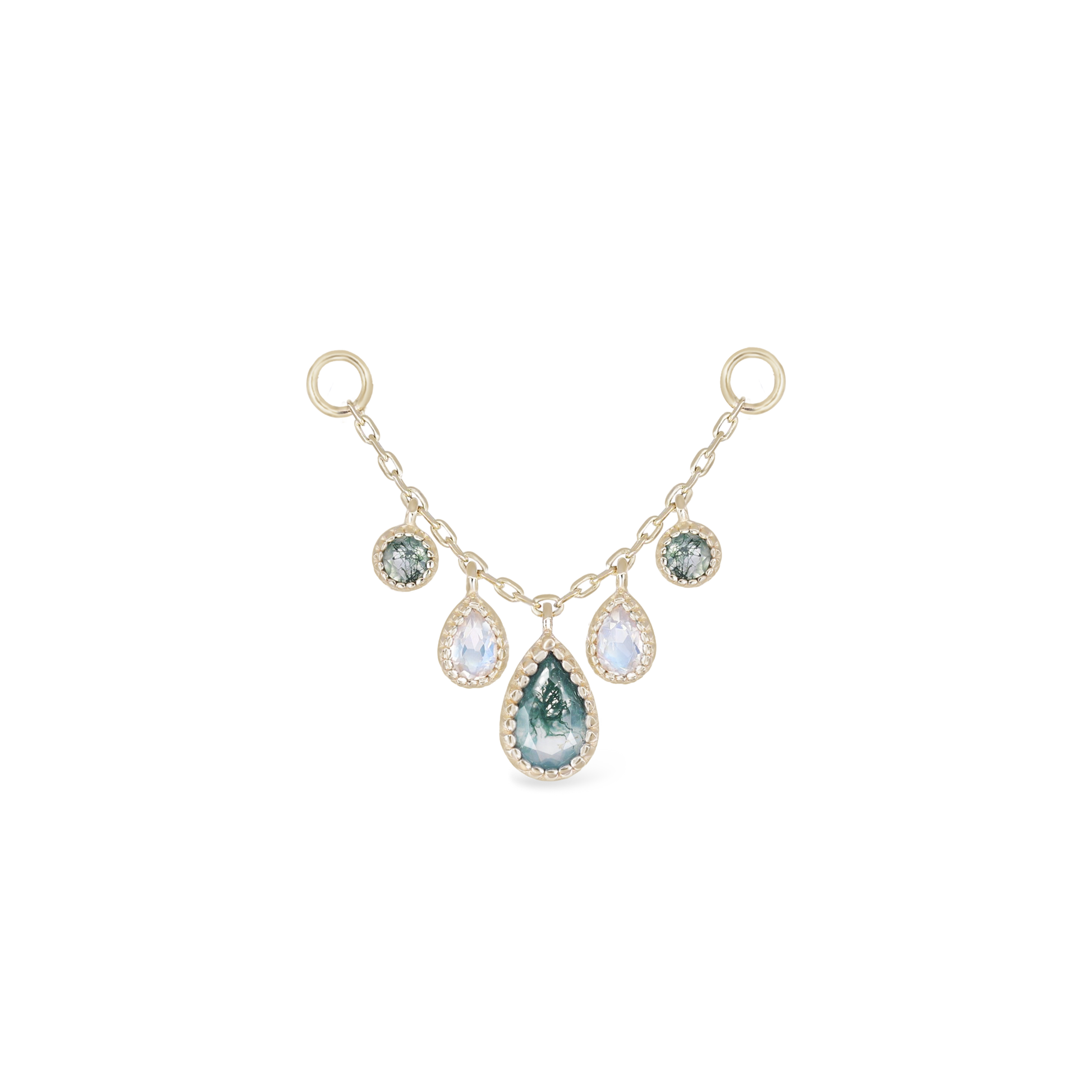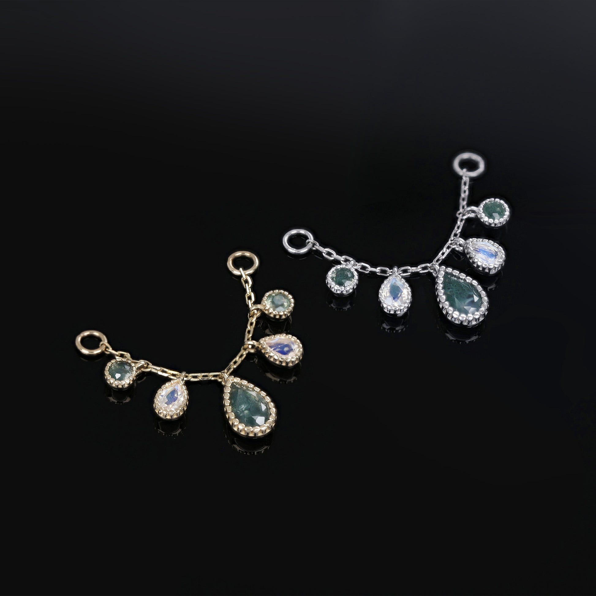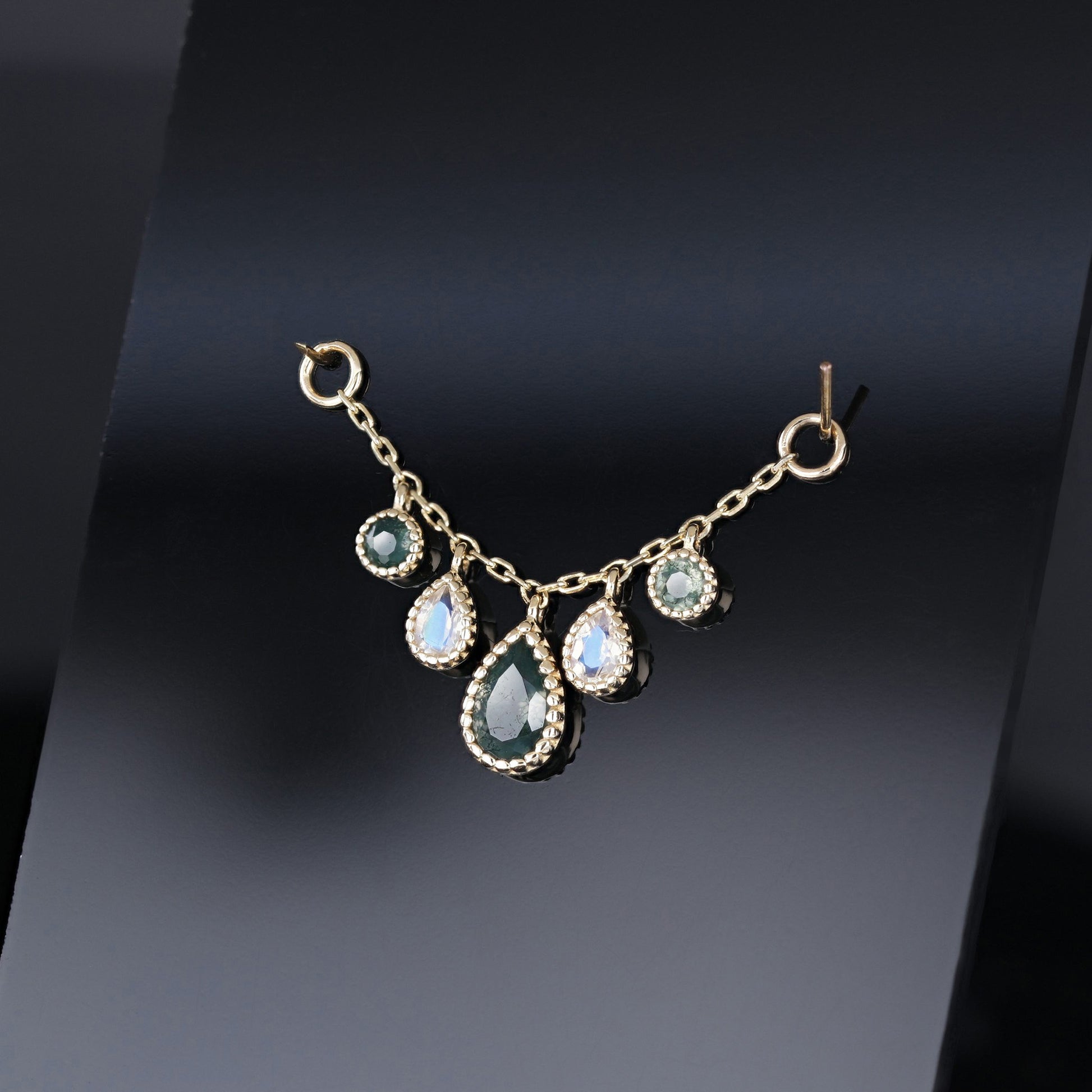 The Colette chain charm brings a touch of refined luxury to any ear stack. Five faceted gemstones cascade gracefully, anchored by a center teardrop framed in intricate milgrain detail. The surrounding round and pear-cut accents create a balanced, chandelier-like effect that shimmers with every movement.