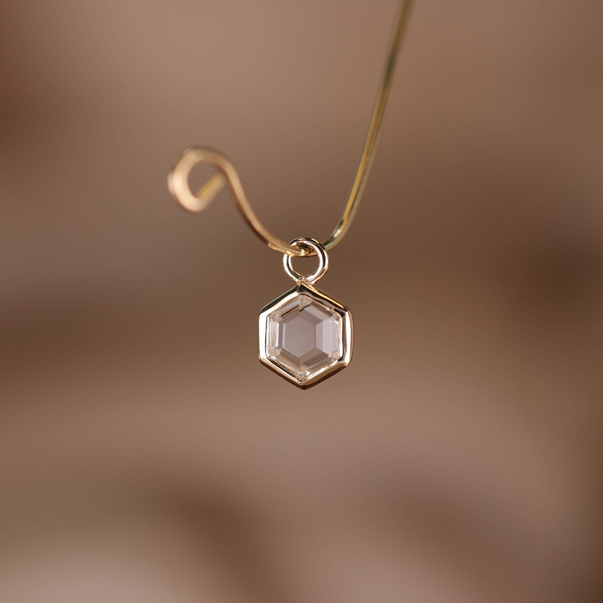 Introducing our versatile Ela charm, born from the transformation of our beloved Ela studs. This elegant accessory features a timeless hexagon facet cut that catches and reflects light beautifully. Designed to be the perfect size, it adds a special touch without overwhelming, suitable for adding to hoops, chains, or as a unique piercing charm. Customize your look with a choice of various gemstones, making this adaptable and sophisticated charm uniquely yours!