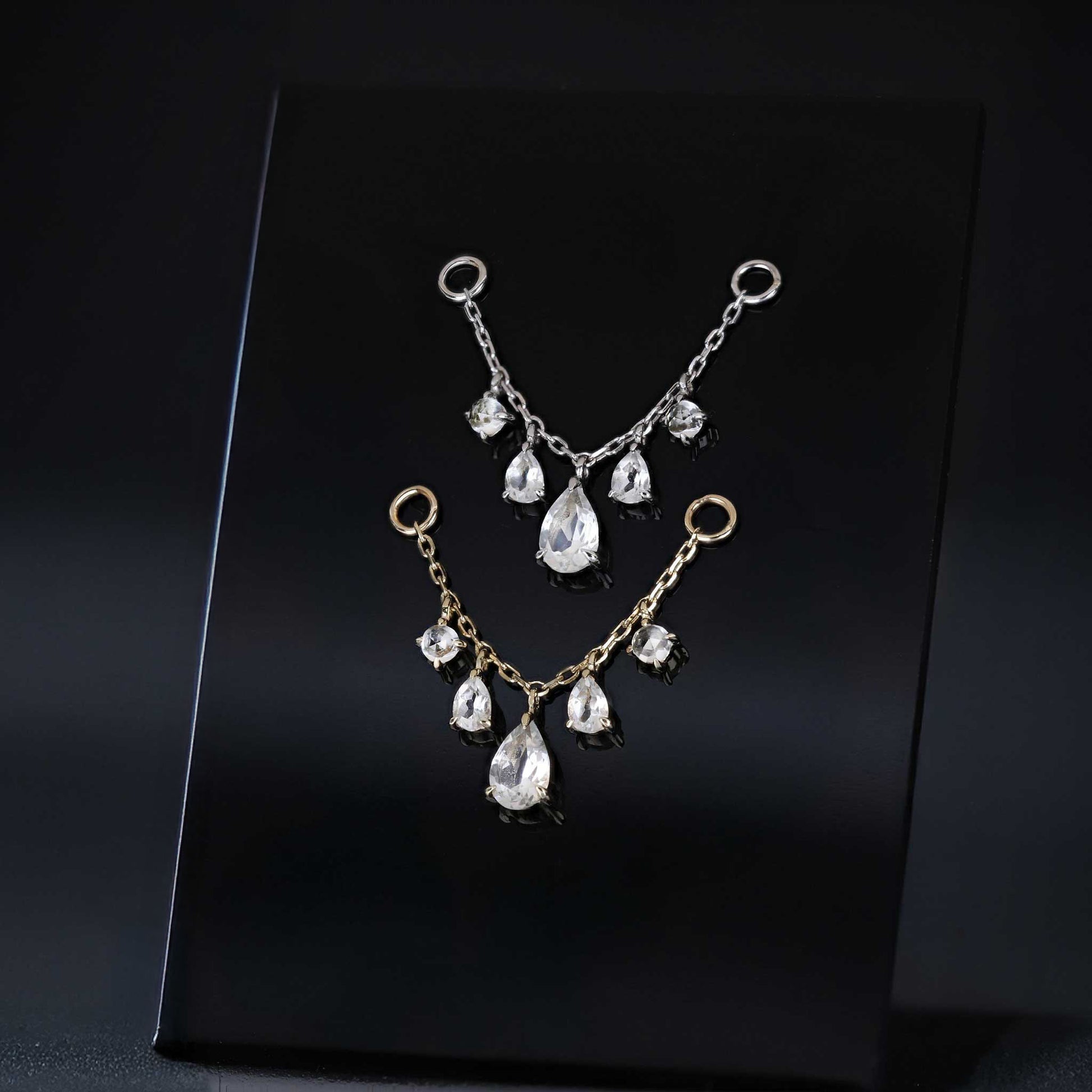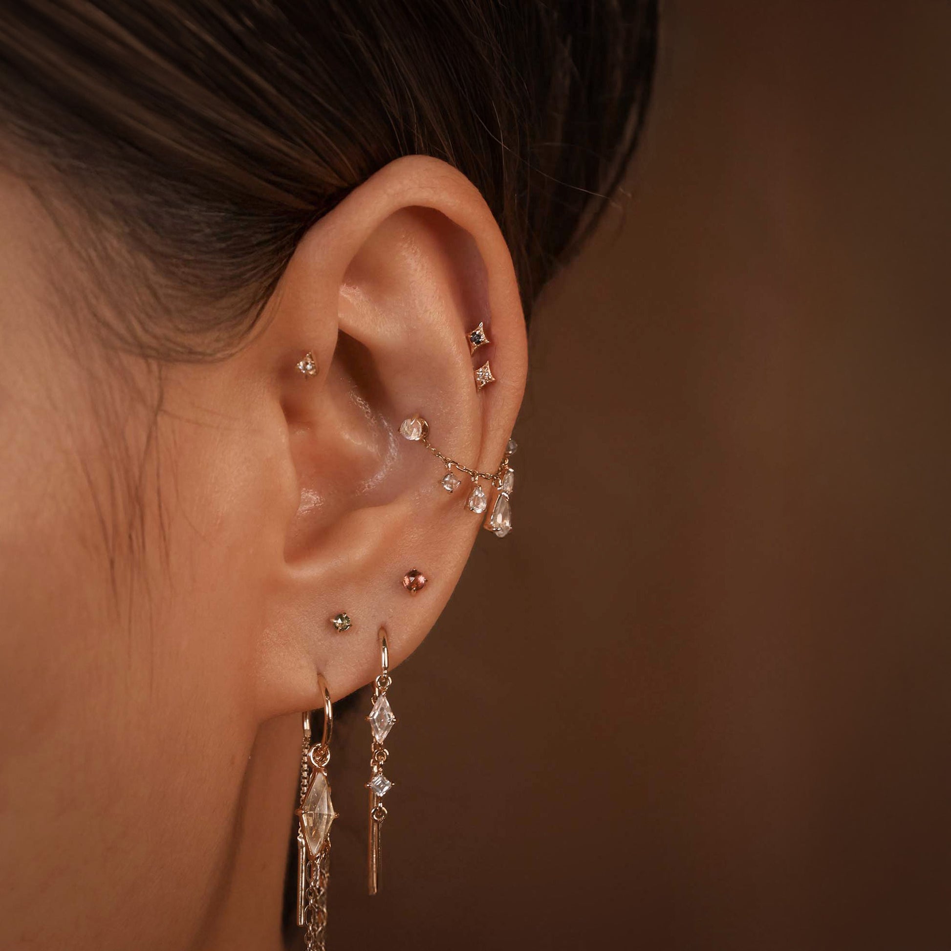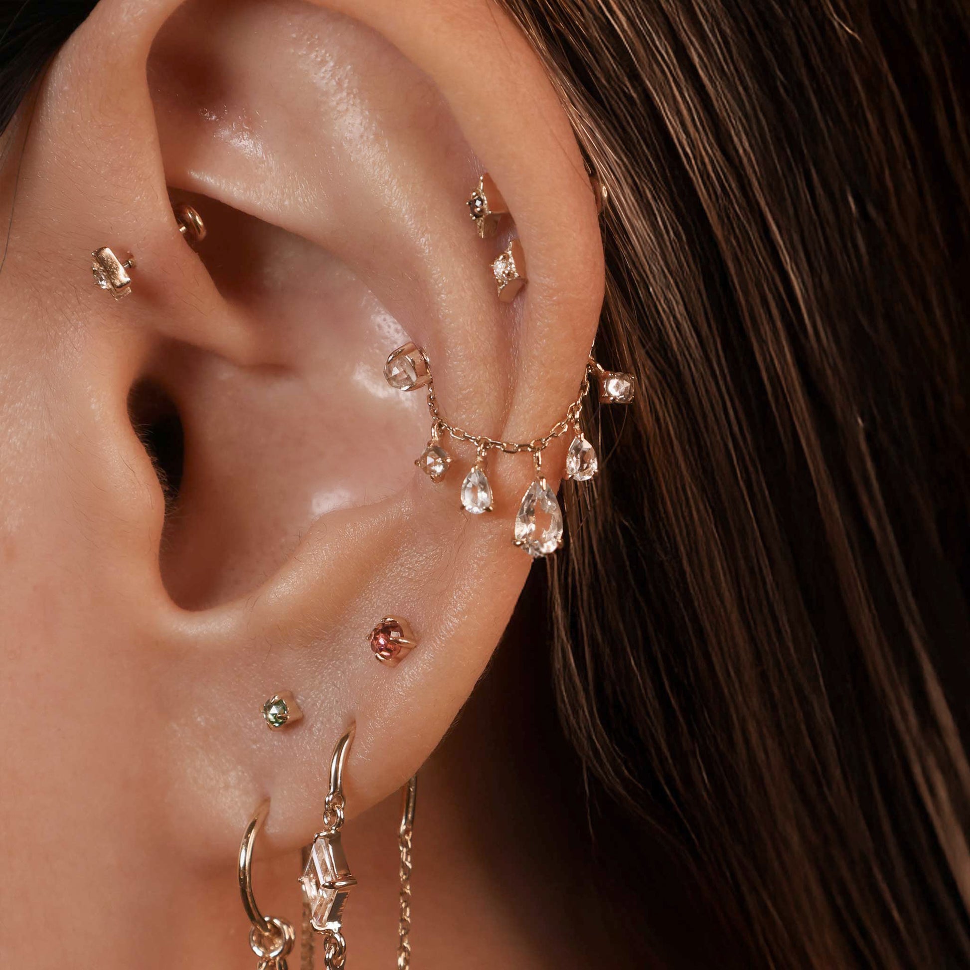 Eloise is a soft, understated chain attachment featuring five white topaz drops that add a gentle sparkle. The silhouette is clean and quiet, with a subtle V-line that sits naturally on the ear. A simple, elegant piece that brings light movement and a refined touch to any piercing stack.