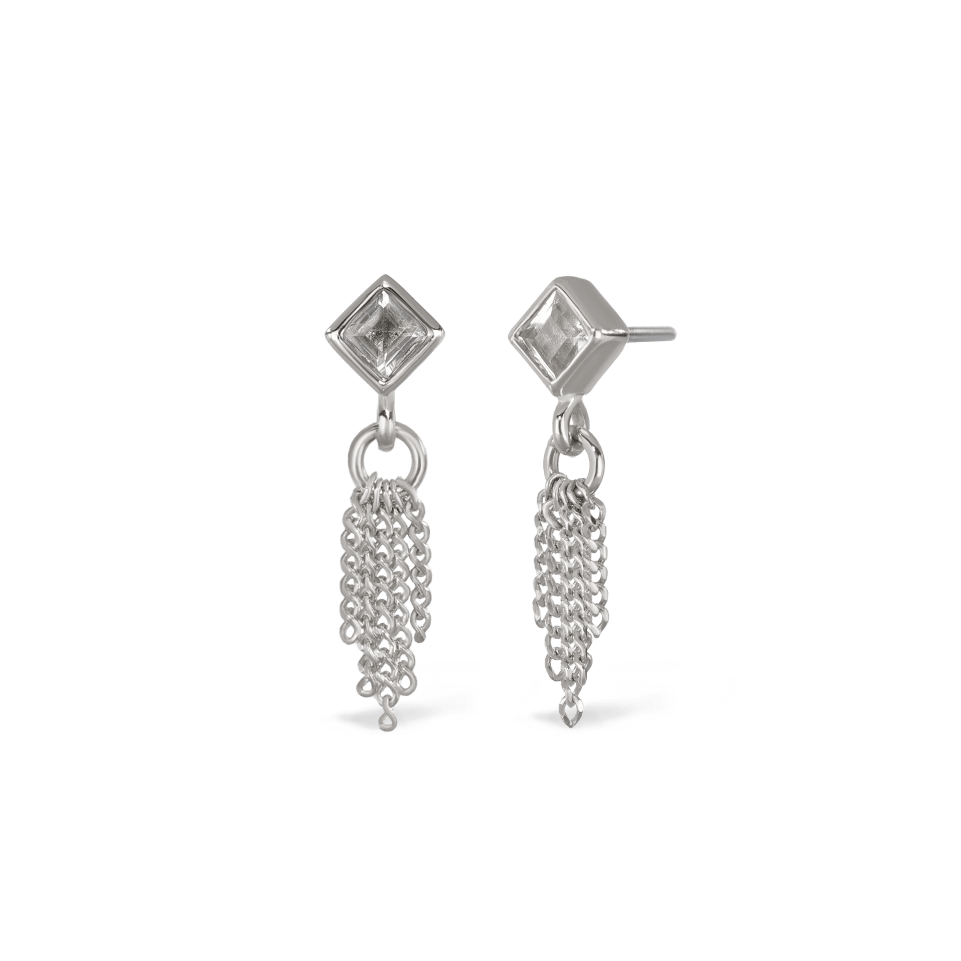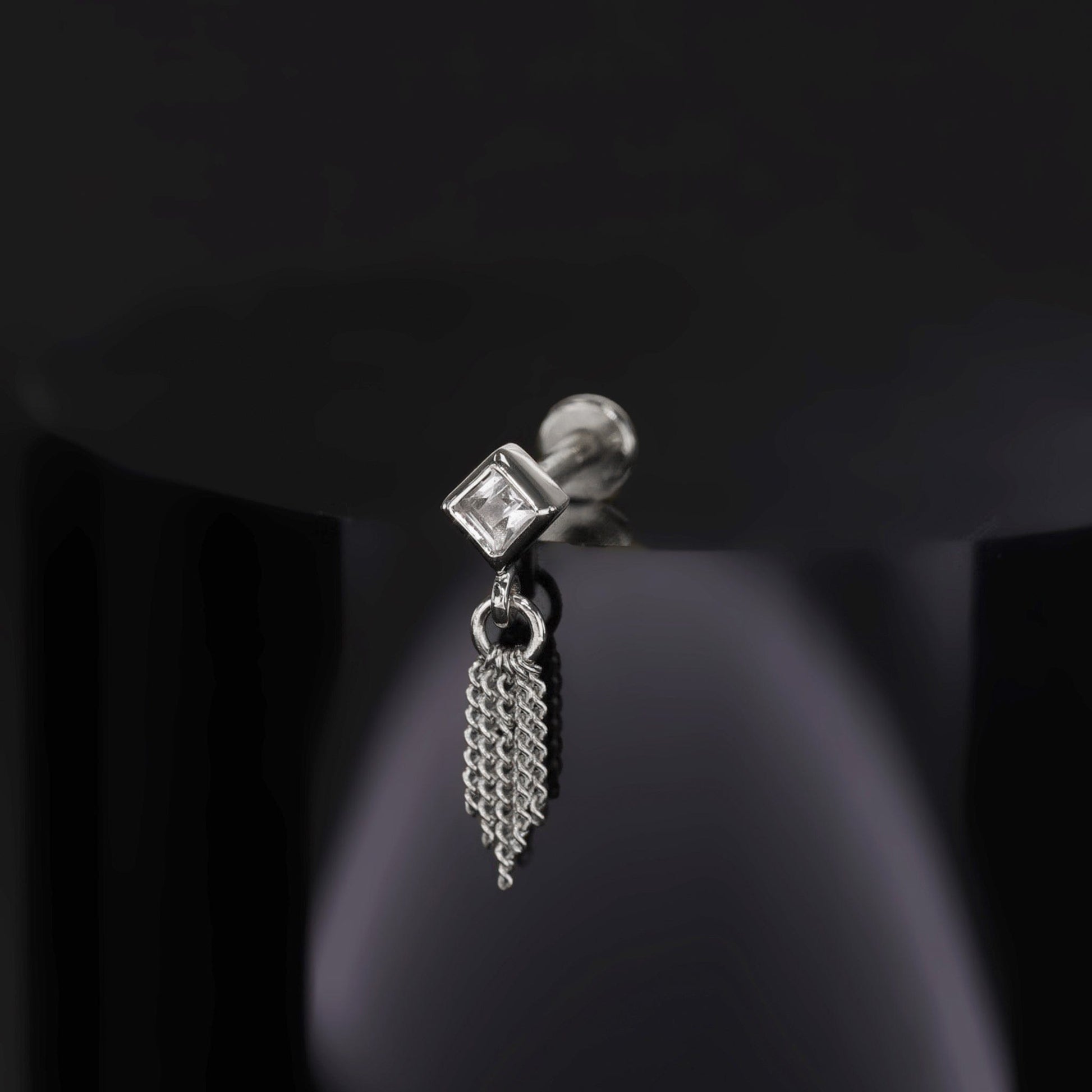 Crafted in 14k solid gold, this threadless push-pin jewelry features a princess-cut natural gemstone as the centerpiece, radiating a refined brilliance. The design is enhanced by five delicate curb chain tassels, adding graceful movement and a touch of elegance.