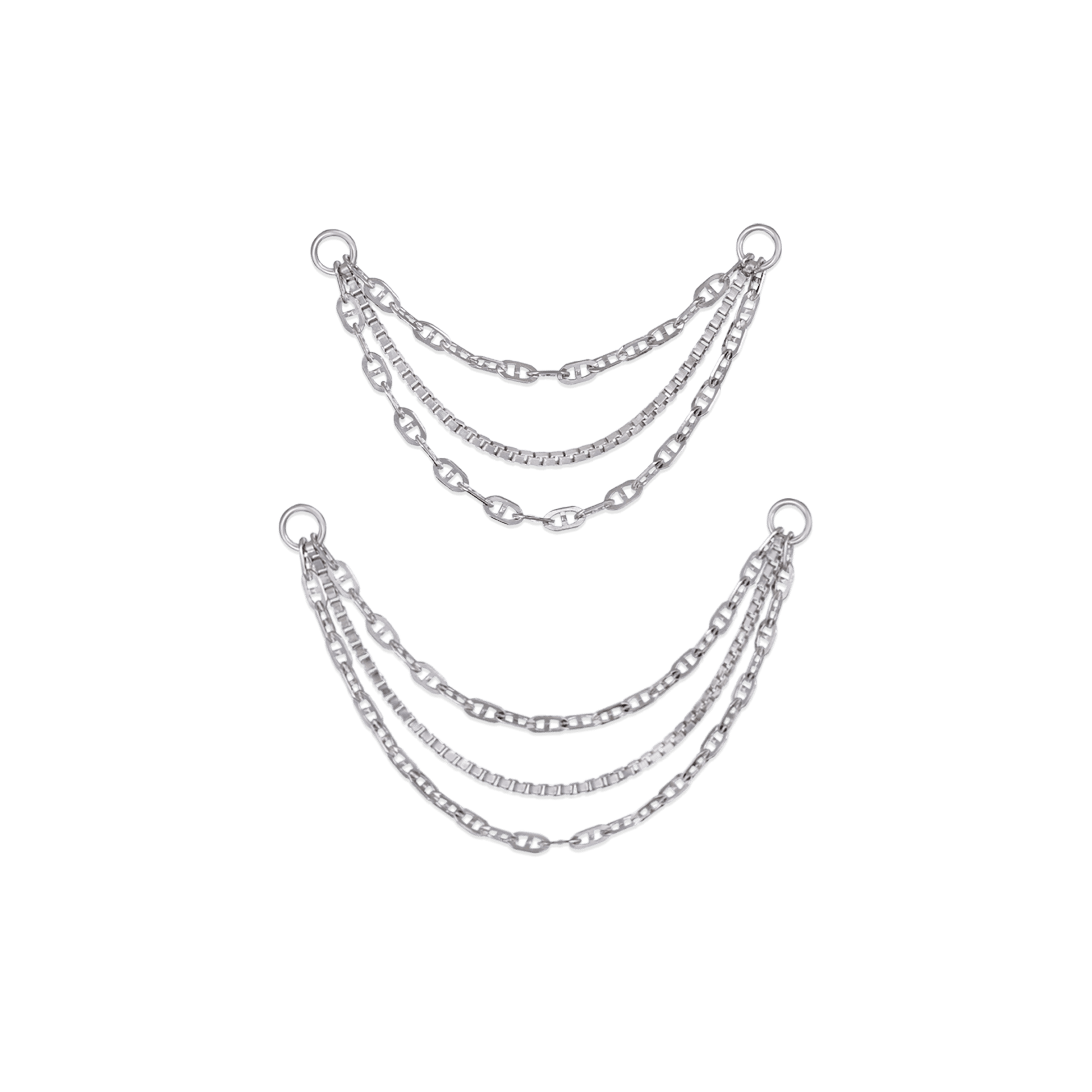 soft, layered chain attachment crafted in solid white gold with a bright rhodium finish. Each piece features three draped chains—two fine anchor links paired with a center box chain—creating a clean, flowing silhouette on the ear.