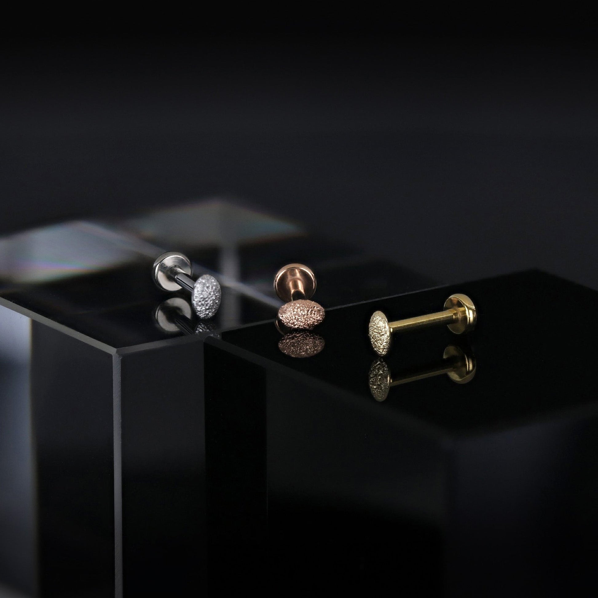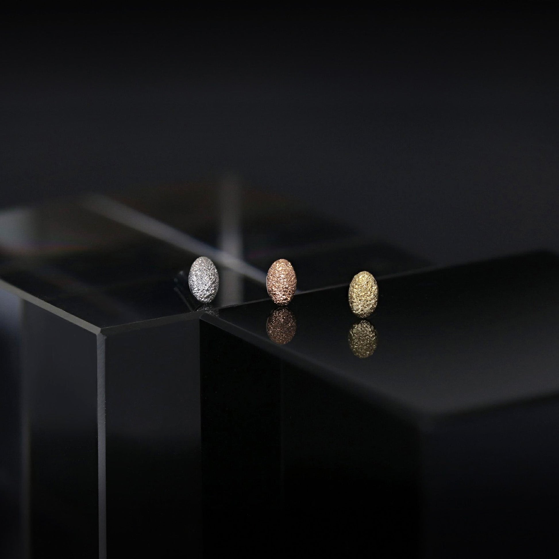 This micro oval flat back stud is crafted in solid 14K gold and finished with a fine sandblasted surface that softly diffuses light. Paired with a universal 25G steel pin, it uses a secure press-fit design for easy, comfortable wear.