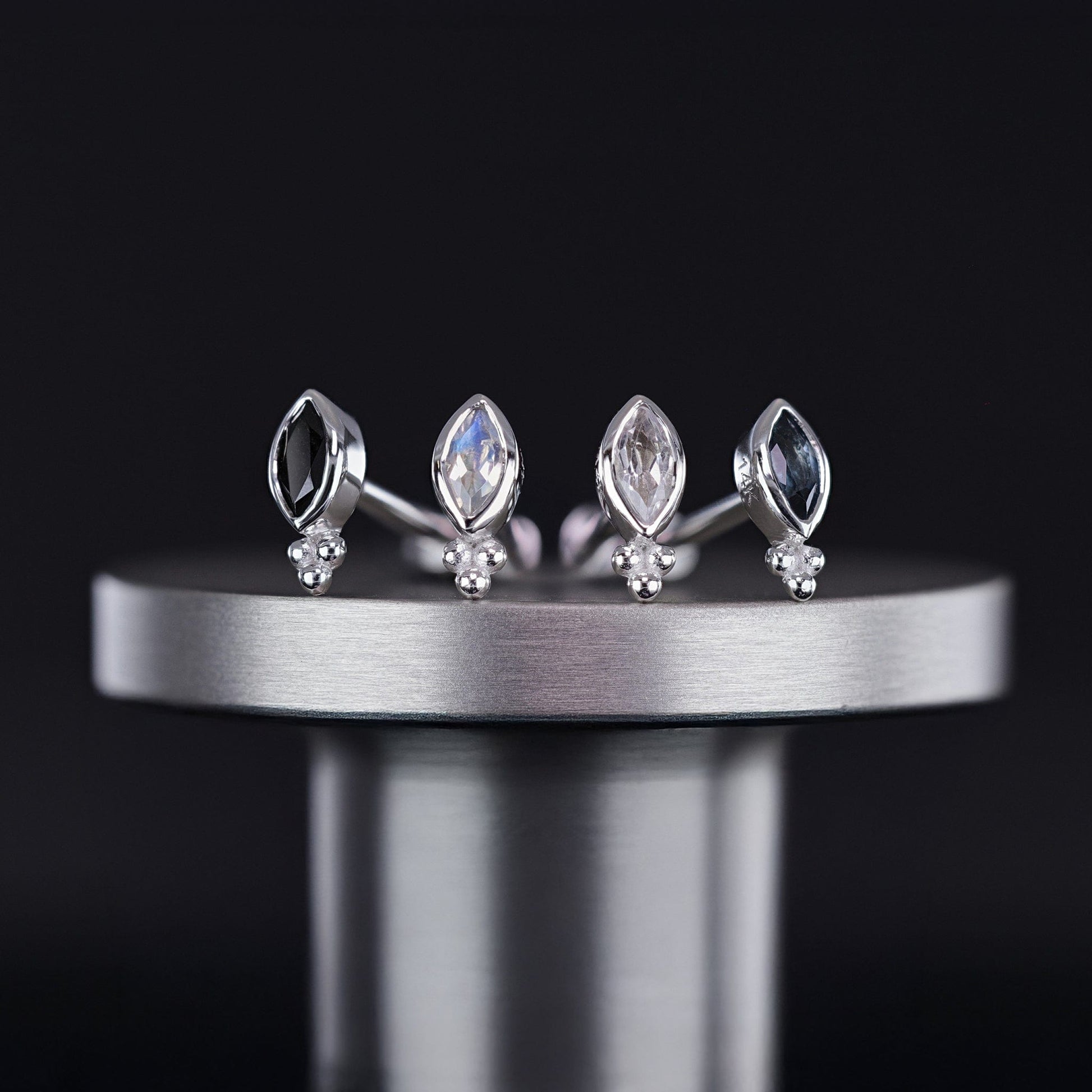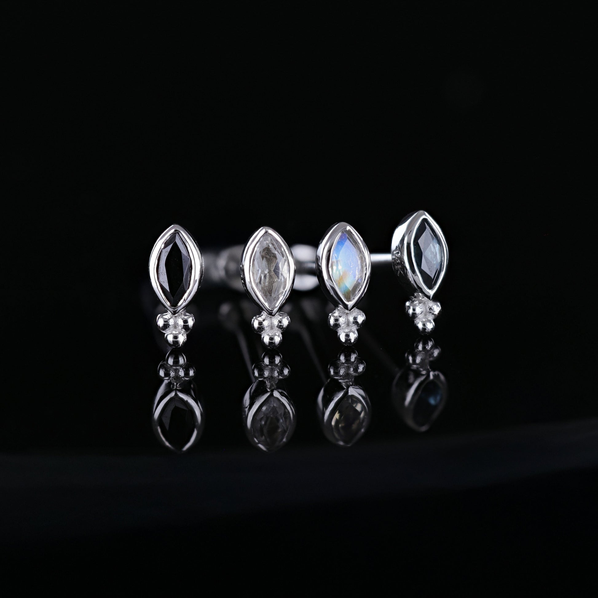 Introducing 'Rue': our Marquise Shape Stud Earrings, crafted in 14k solid gold—nickel and cadmium free for your comfort. Each gemstone is expertly cut to showcase its natural splendor. Designed for easy insertion, Rue features a secure, threadless stud with a mirror-polished, matching gold-colored anodized titanium post. Perfect alone for a subtle touch of elegance or layered for a personalized ear stack, Rue is a classic yet versatile addition to your collection.