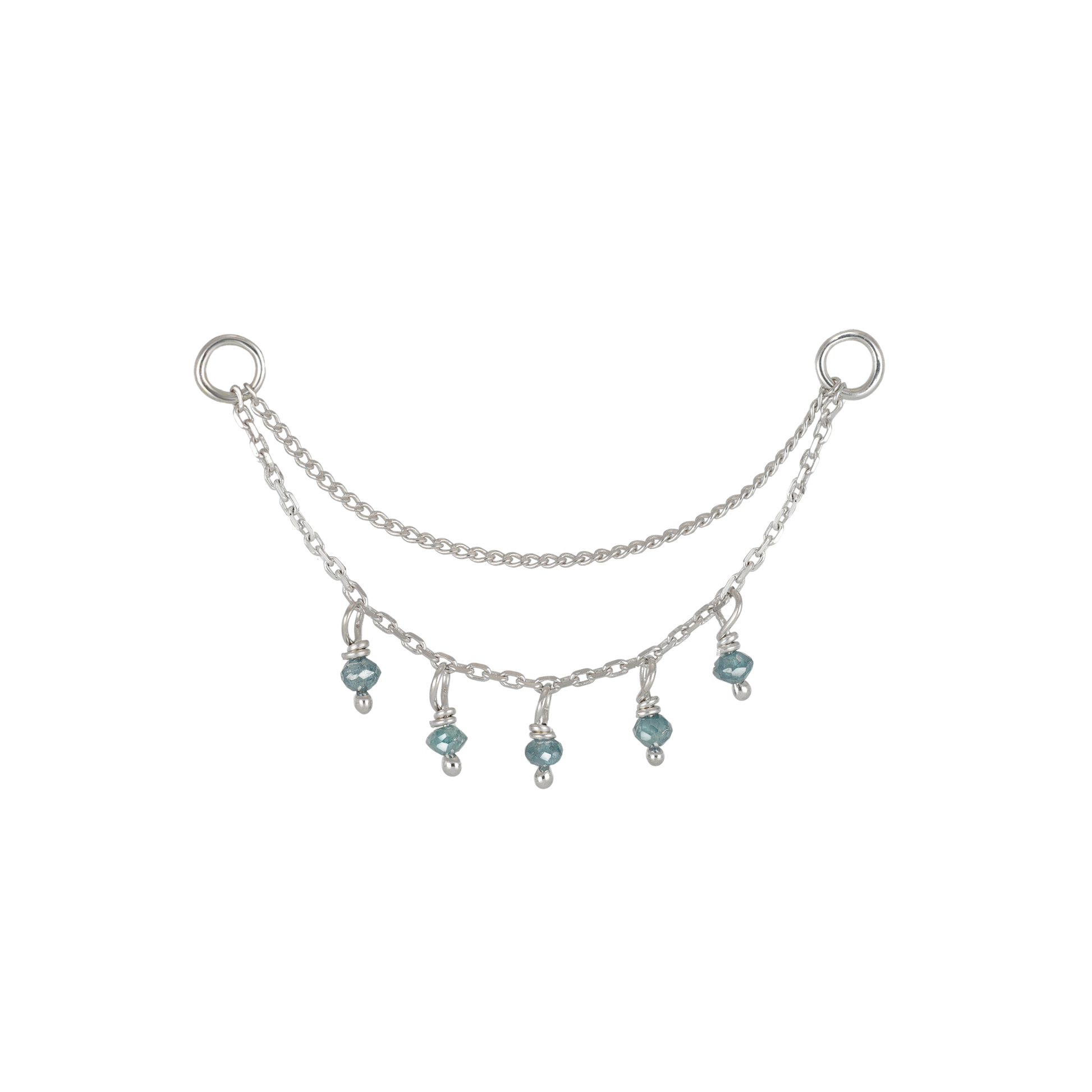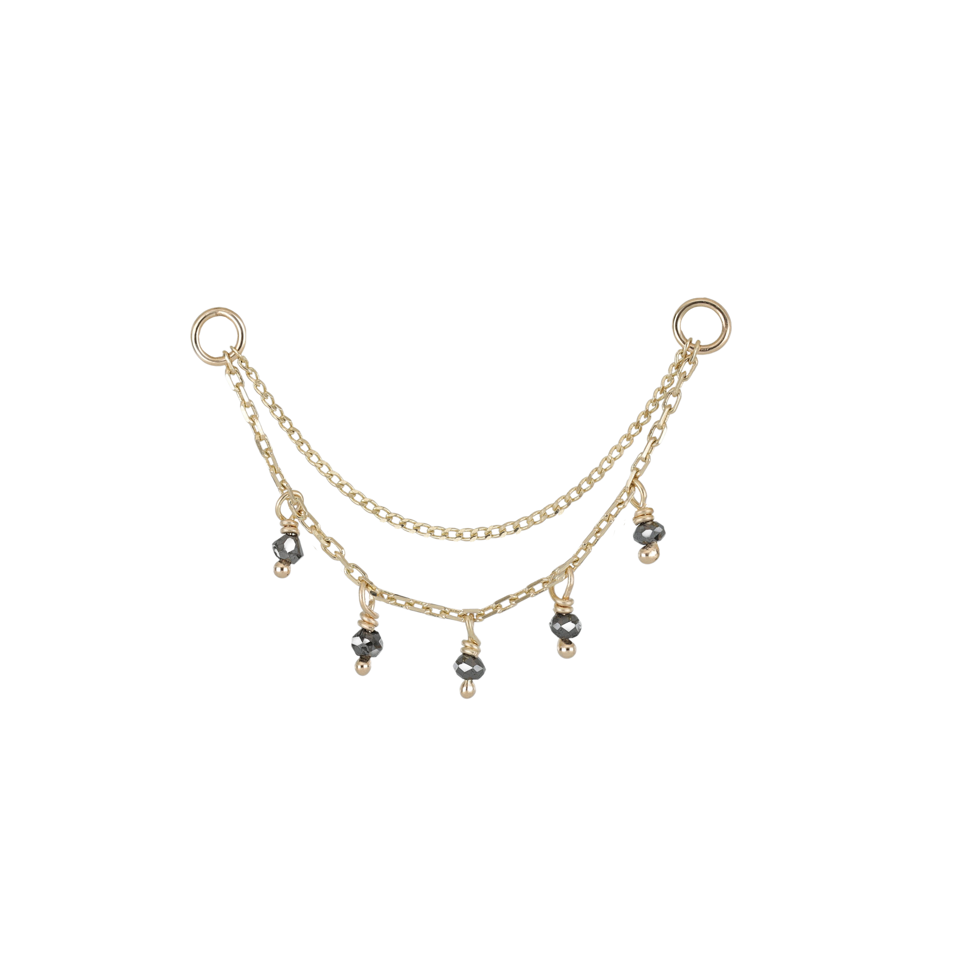 This 14k solid gold piercing chain combines elegance and versatility with two distinct chain styles: a 30mm delicate curved chain on the upper layer and a 36mm cable chain on the lower layer. The lower chain is adorned with hand-faceted rough green, black and blue diamond beads, each approximately 1.5mm in size, showcasing natural variations that make every piece unique.
