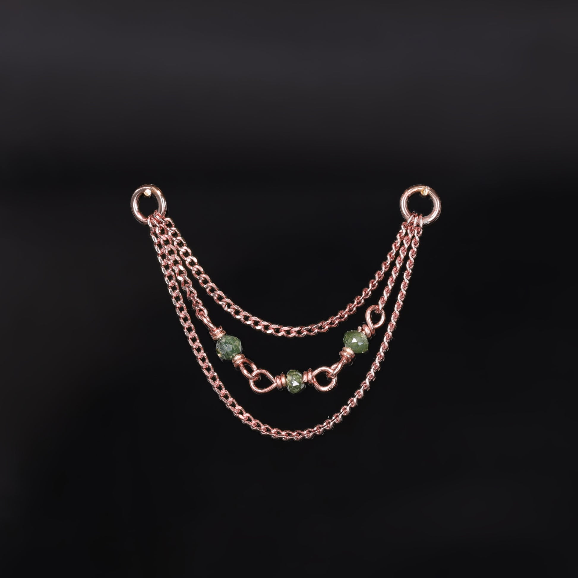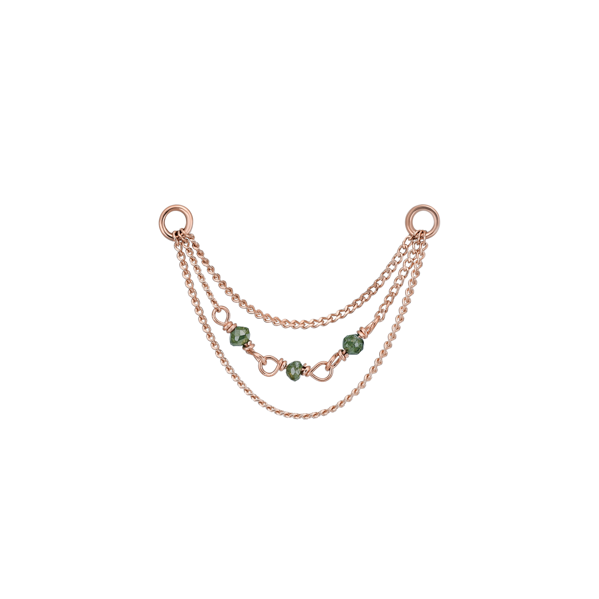 Crafted from 14K solid gold (Rose gold also available), this exquisite piece marries durability with a delicate design. The Sisley Diamond Bead Triple Chain features tiny, multi-faceted green rough diamond beads that offer a subtle yet sparkling beauty. Each bead is carefully chosen for its unique charm, ensuring no two pieces are exactly alike.