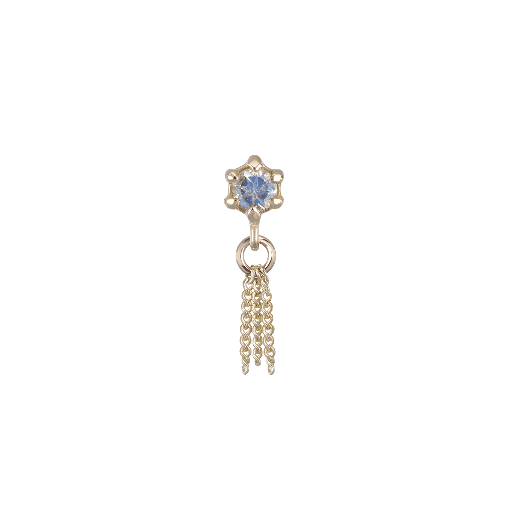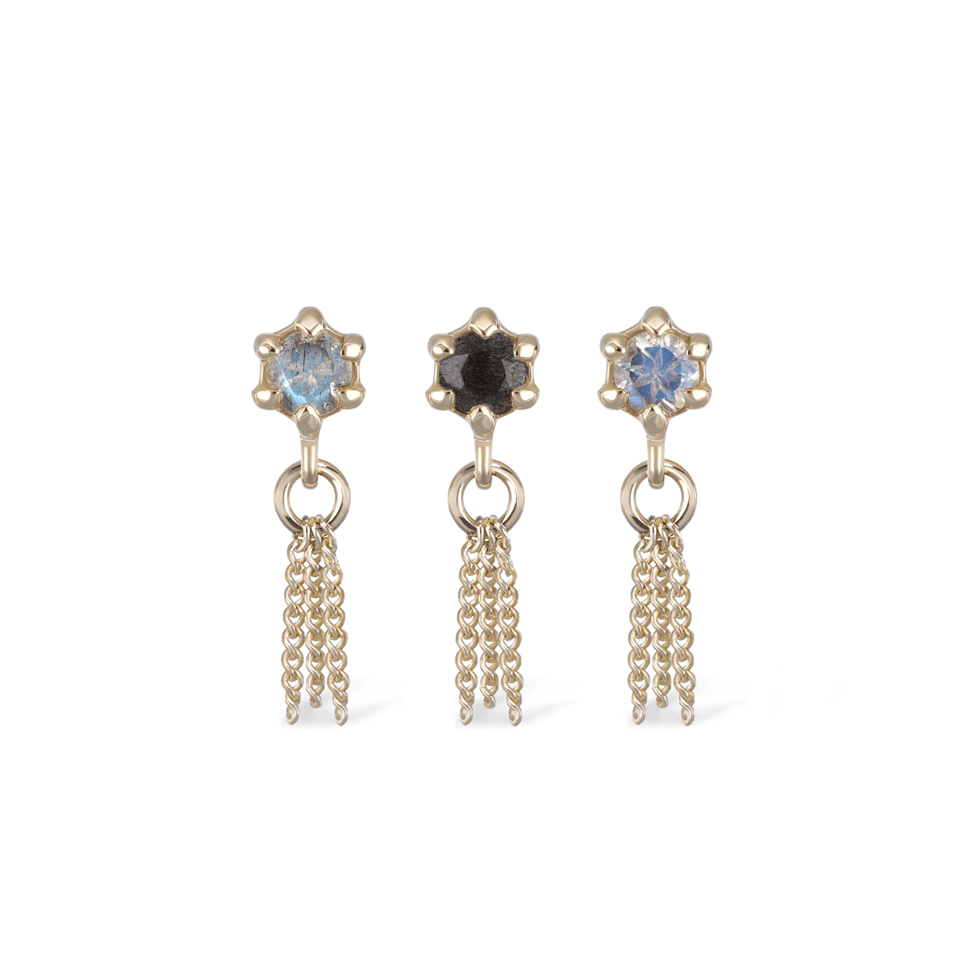 Available in both black and traditional labradorite, The Starlet pieces capture the stone's protective and intuitive qualities. Each gemstone is precisely faceted and set in a six-prong 14k solid gold mount, showcasing its deep, mesmerizing iridescence. Delicate cable chain tassels drape elegantly from each setting, adding a layer of sophistication.