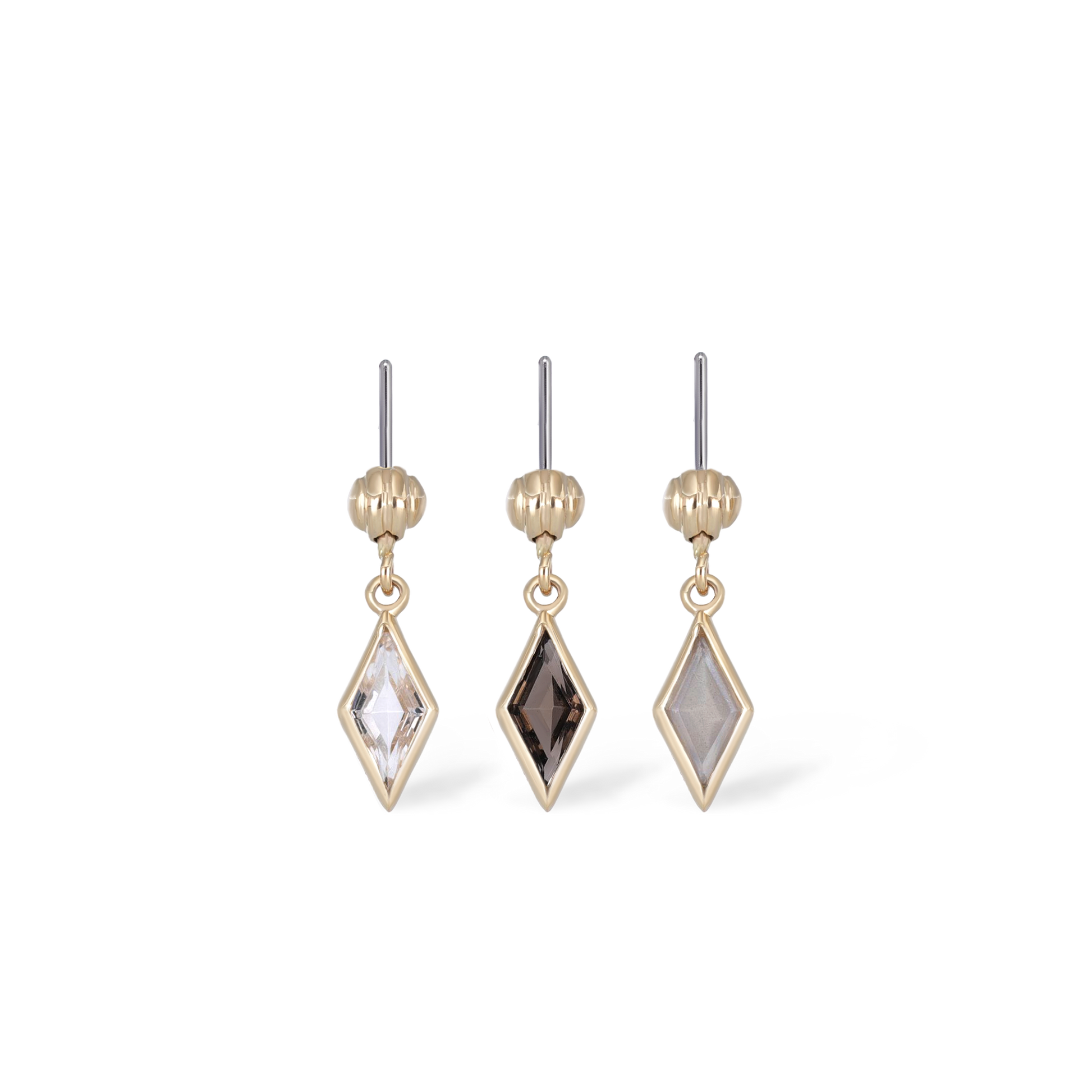 The Xena Drop features a rhombus-cut stone - available in white topaz, grey moonstone, or smoky quartz - that moves freely beneath a semi-hollow textured ball. Designed as a threadless end, it’s perfect for vertical helix (hidden helix), inner conch, or lobe placements. The sharp lines of the geometric cut bring a clean, modern feel, balanced by a soft swing and subtle sparkle in motion.